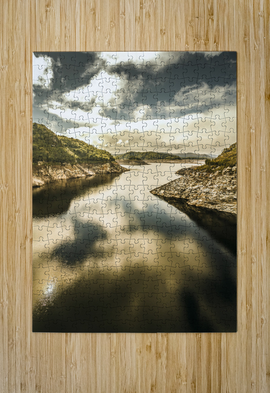 Cloudy blue lake reflections on a peaceful countryside dam in tranquil stillness. Gordon River Southwest Tasmania Australia