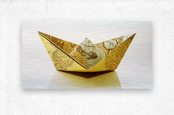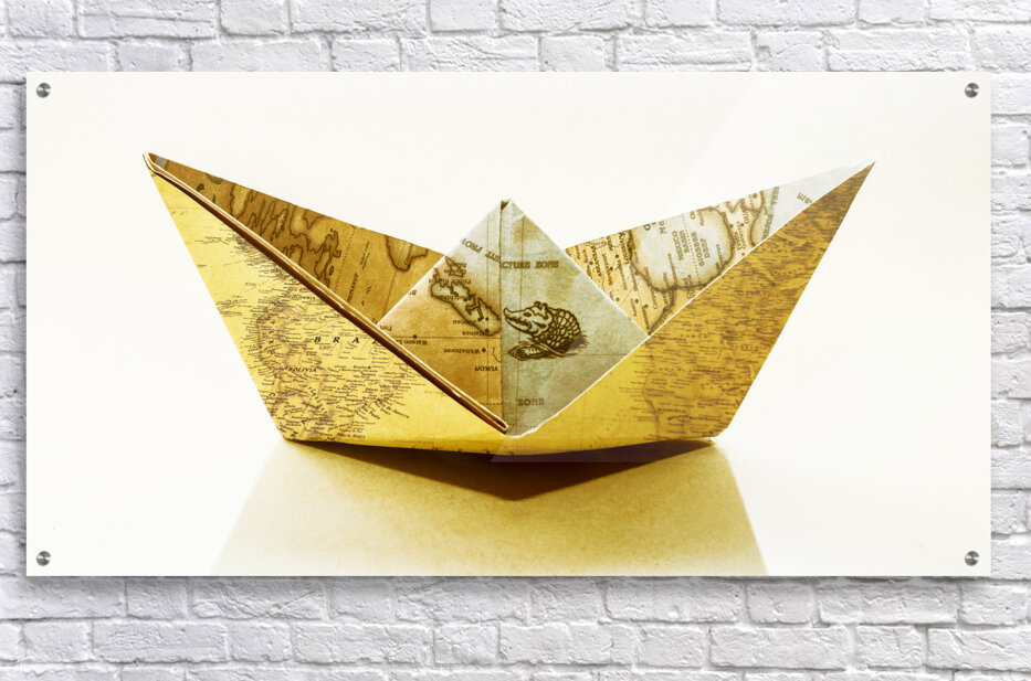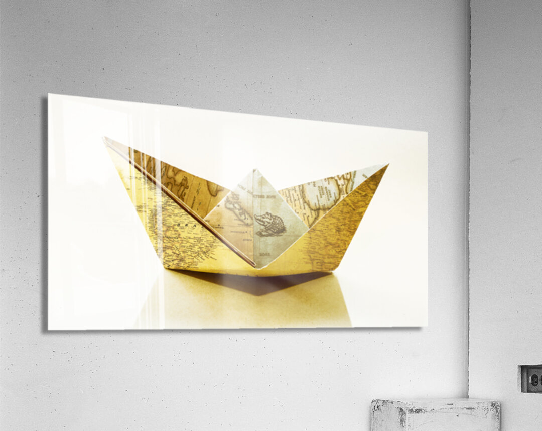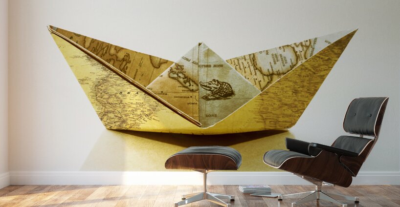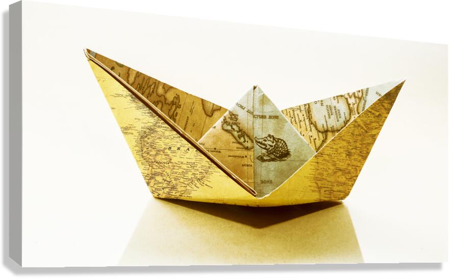 Nautical still life photo on a paper boat mapped in shipping routes from world destinations. Lines and seas