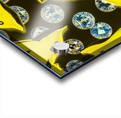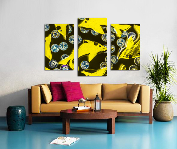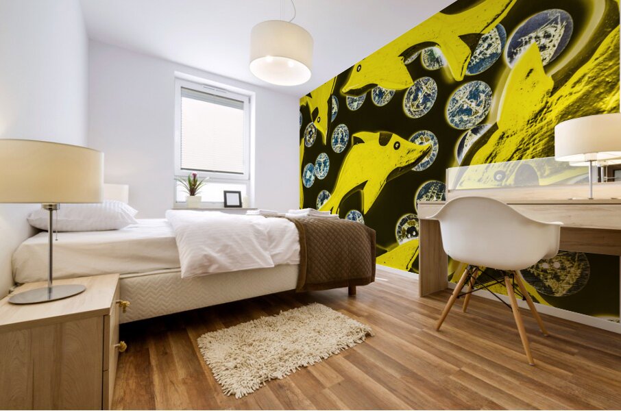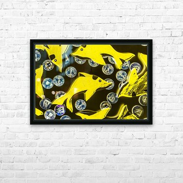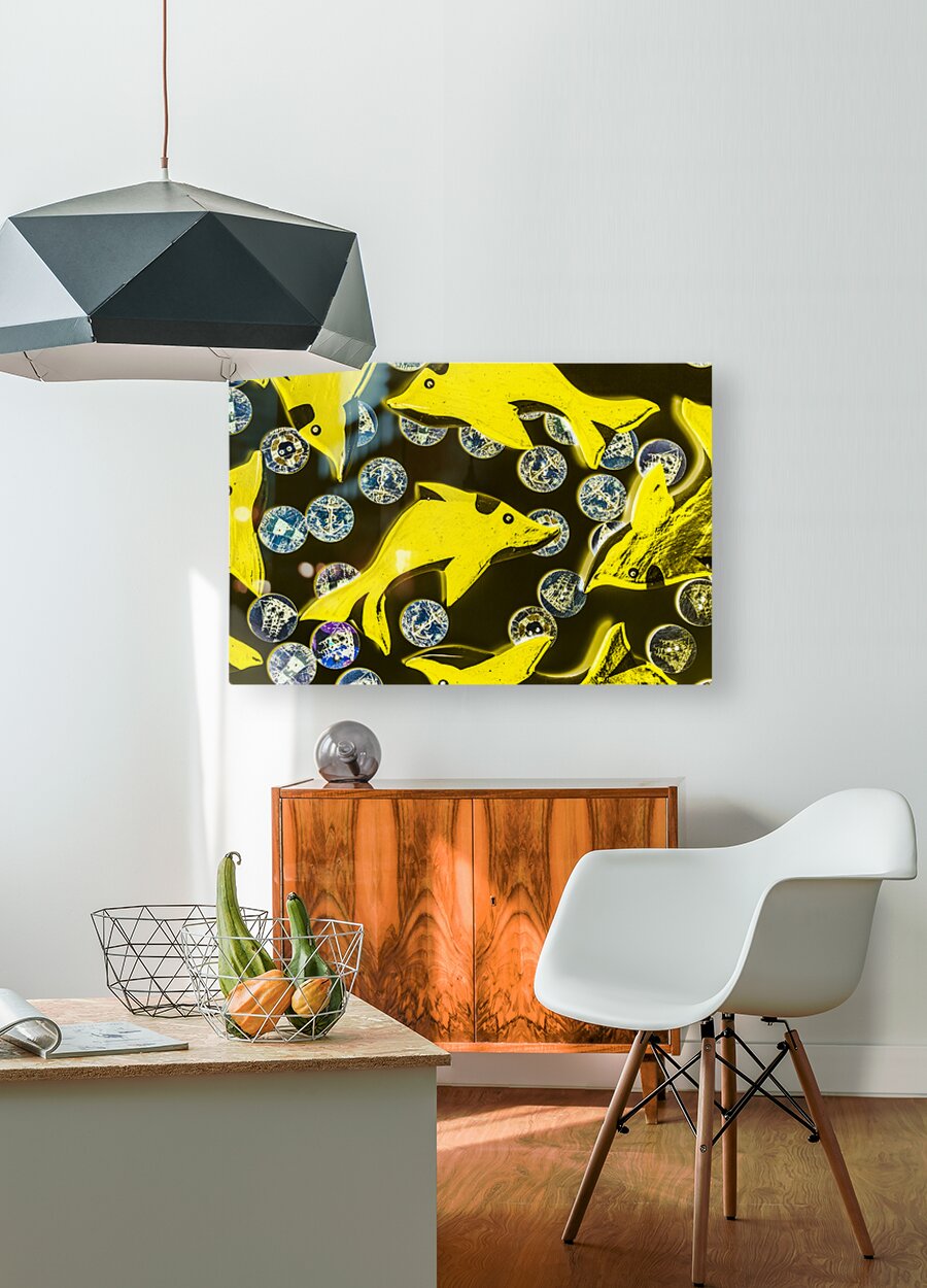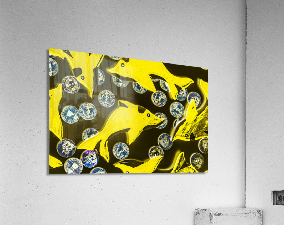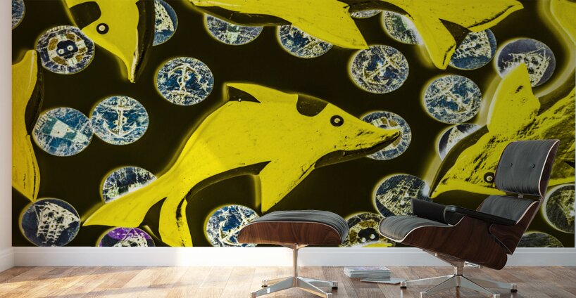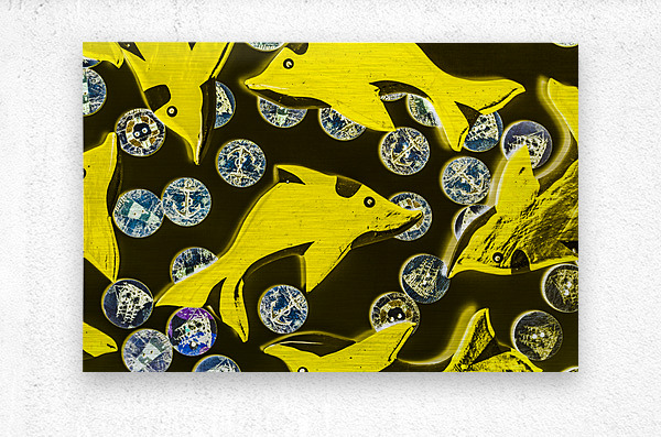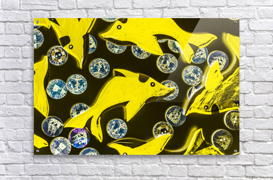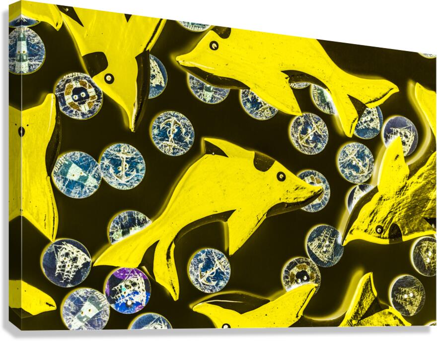 Creative still-life design on a mix of summer yellow dolphins abstracted with maritime button bubbles. Doll fins