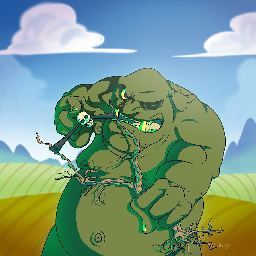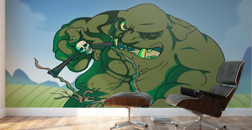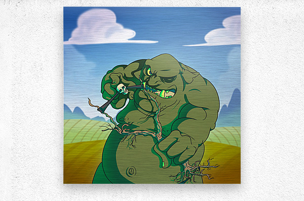 Cartoon illustration of a giant ogre in a green field shooting human skulls with a tree slingshot. Mythical Creatures