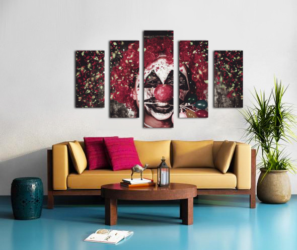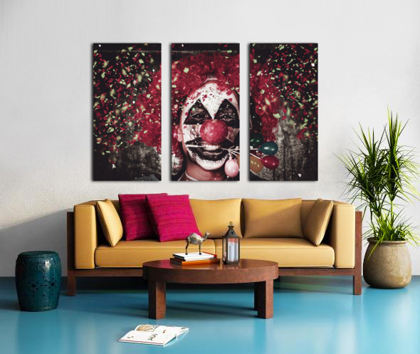 Horizontal close-up portrait on the face of a mad carnival clown holding balloon cake decoration in mouth under a fall of confetti. Celebrating Halloween
