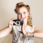 BEAUTIFUL WOMAN PHOTOGRAPHER HOLDING RETRO CAMERA