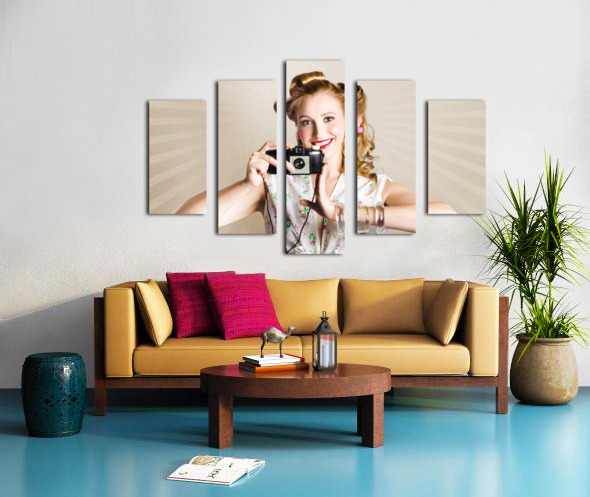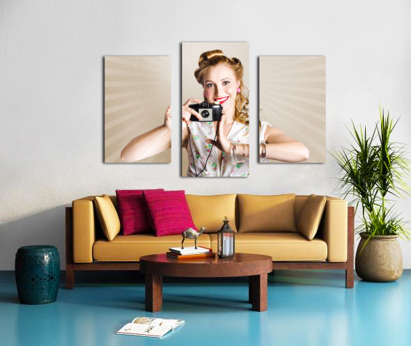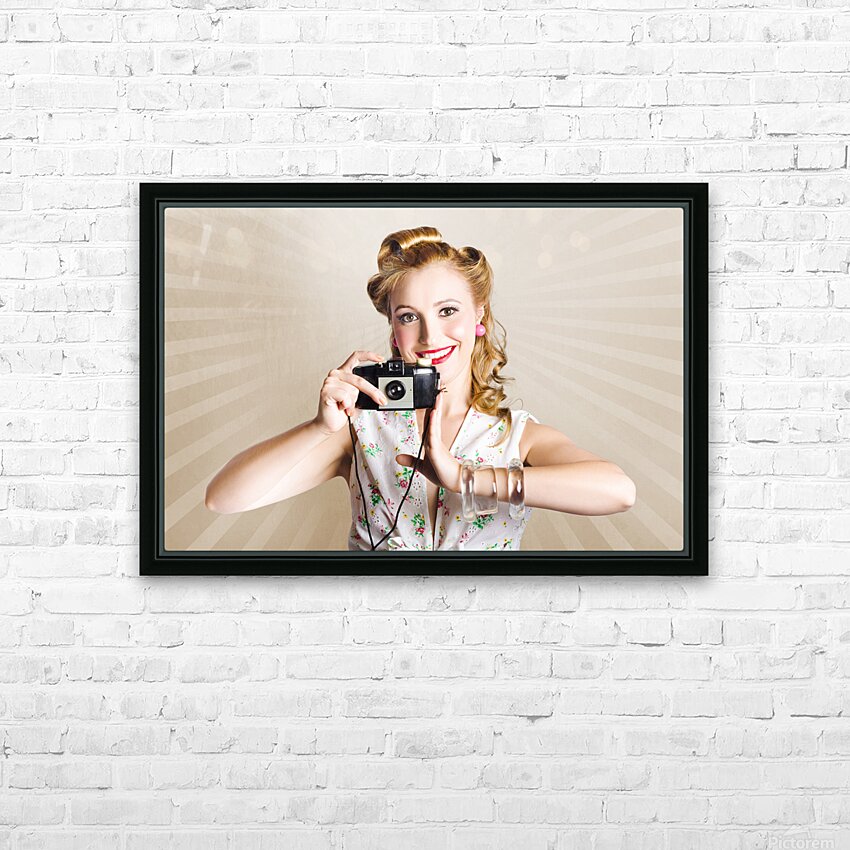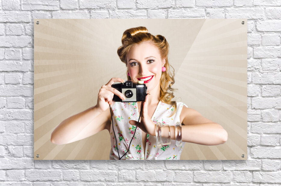 Beautiful Woman Photographer Holding Retro Camera Picture Frame Printing