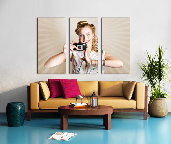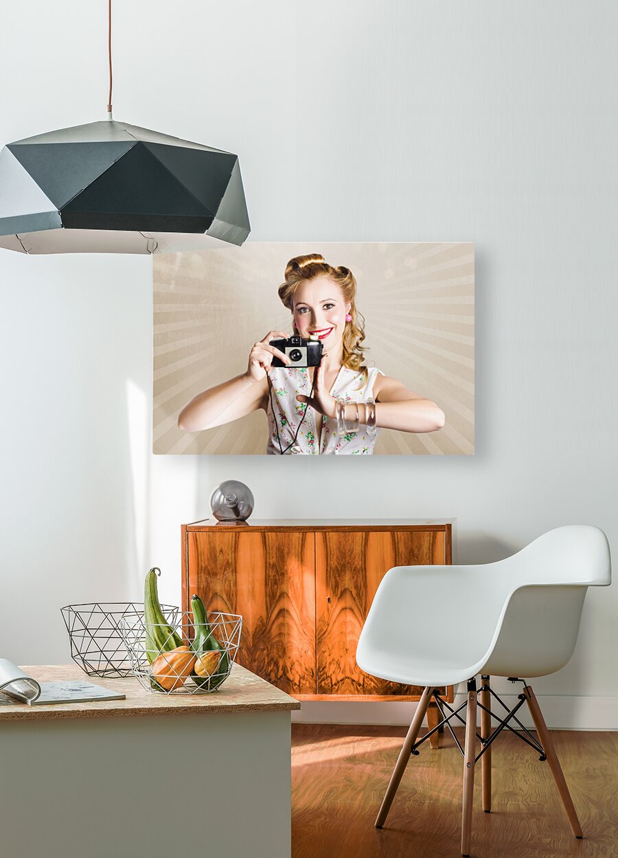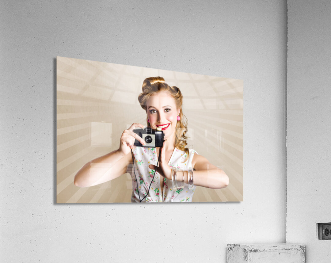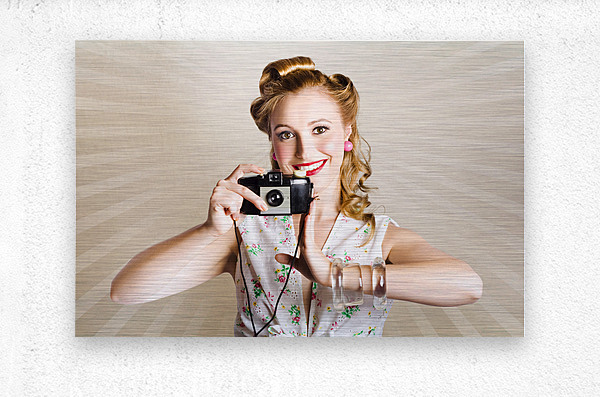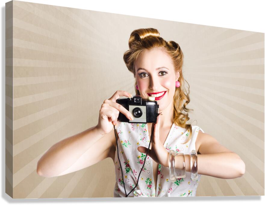 ABOUT THIS ARTWORK: BEAUTIFUL WOMAN PHOTOGRAPHER HOLDING RETRO CAMERA