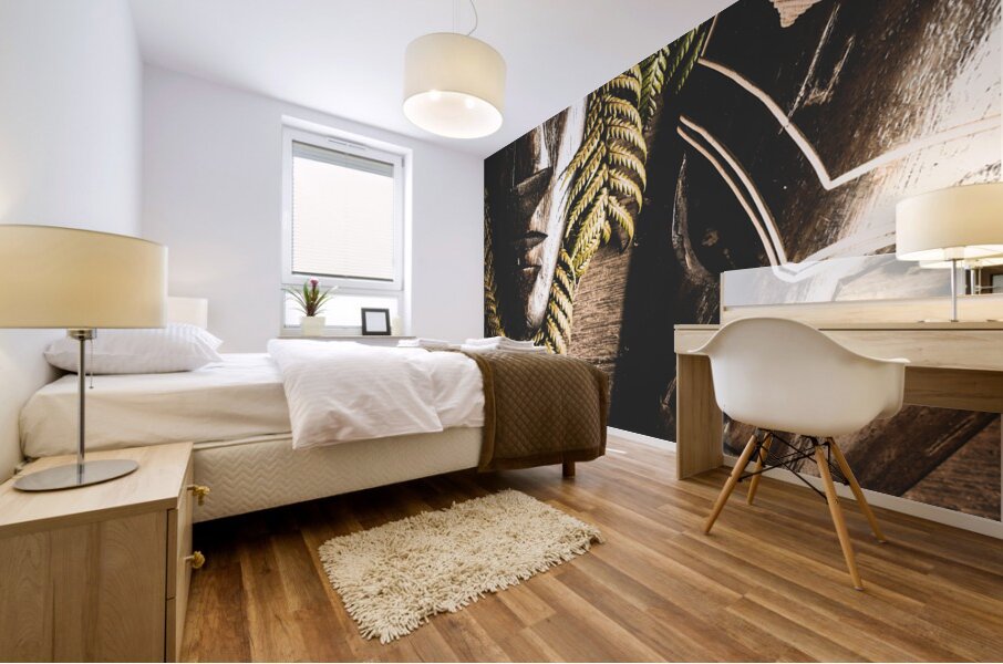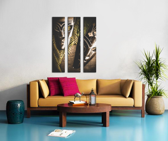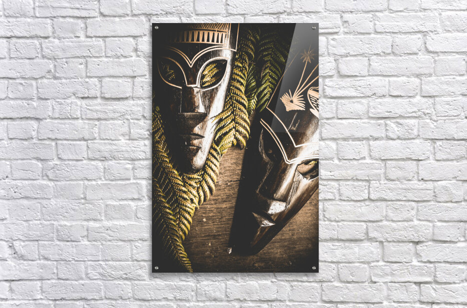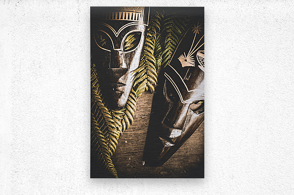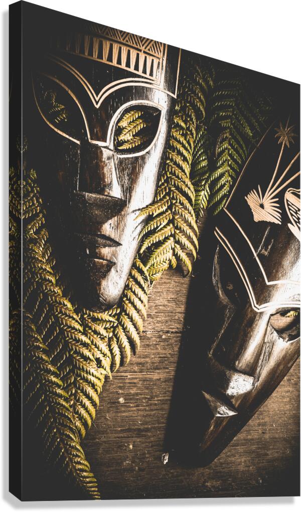 ABOUT THIS ARTWORK: TRIBAL MASKS WITH FERNS ON WOODEN TABLE
