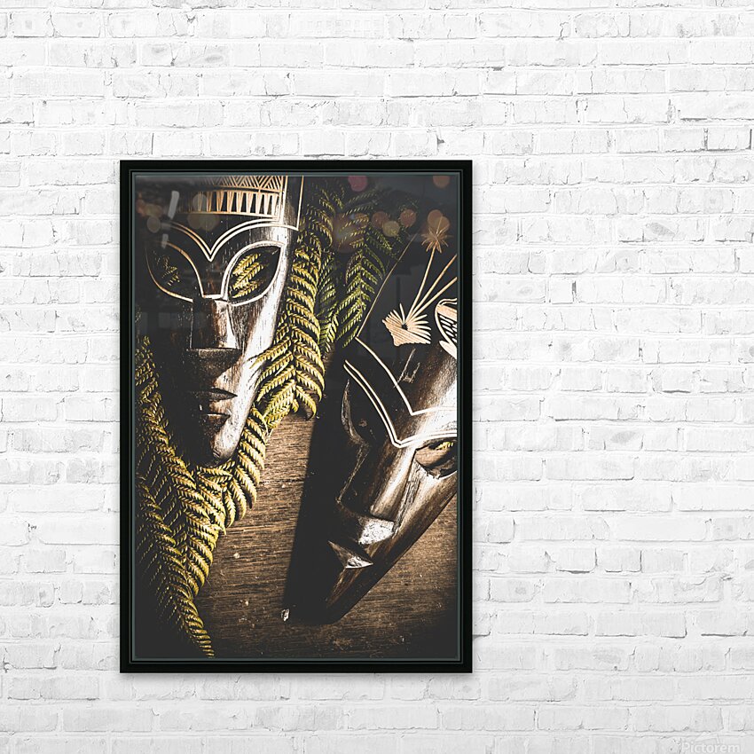 Tribal Masks With Ferns On Wooden Table Frame print