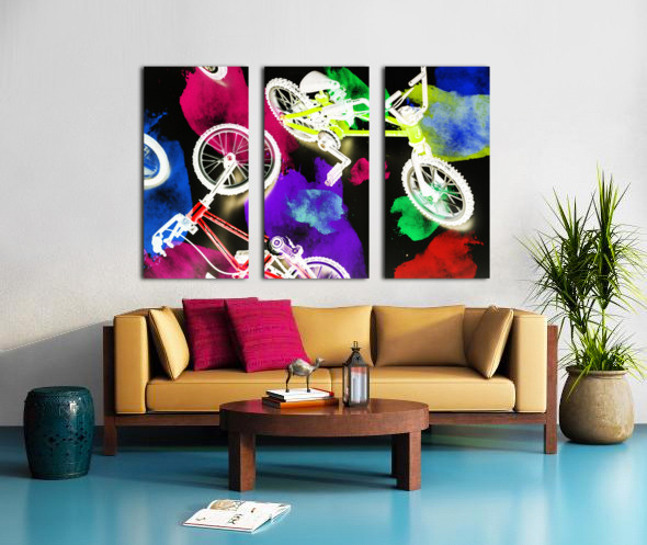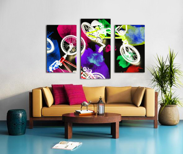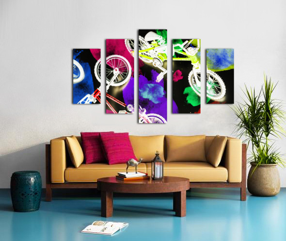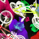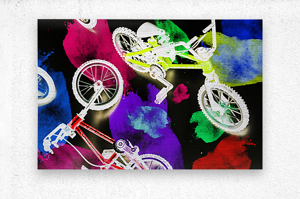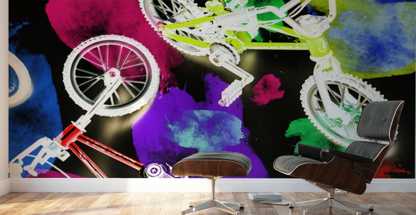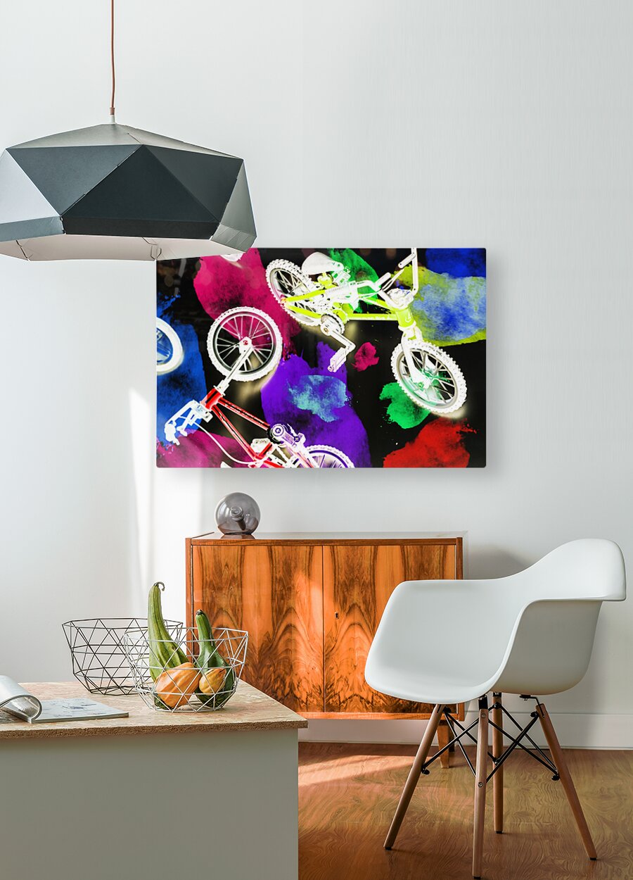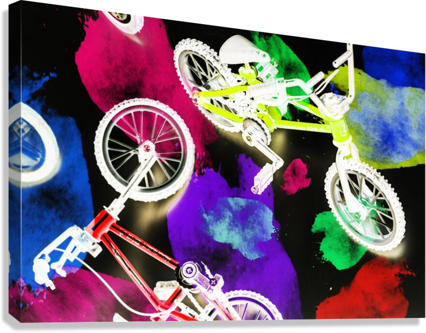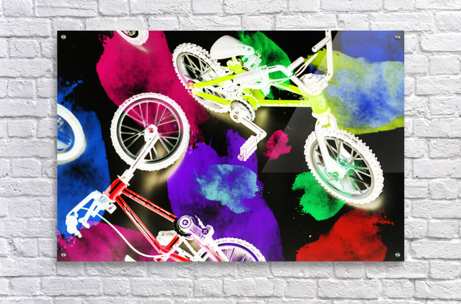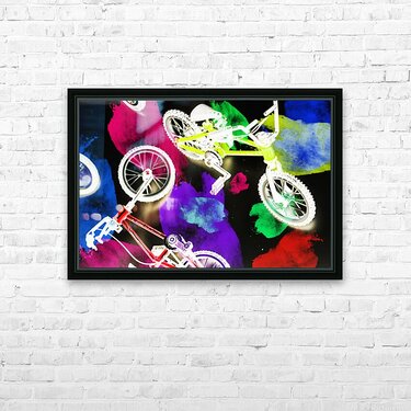 Dark urban design on a mix of colorful graffiti spray paint and bmx bicycles. Street bike art