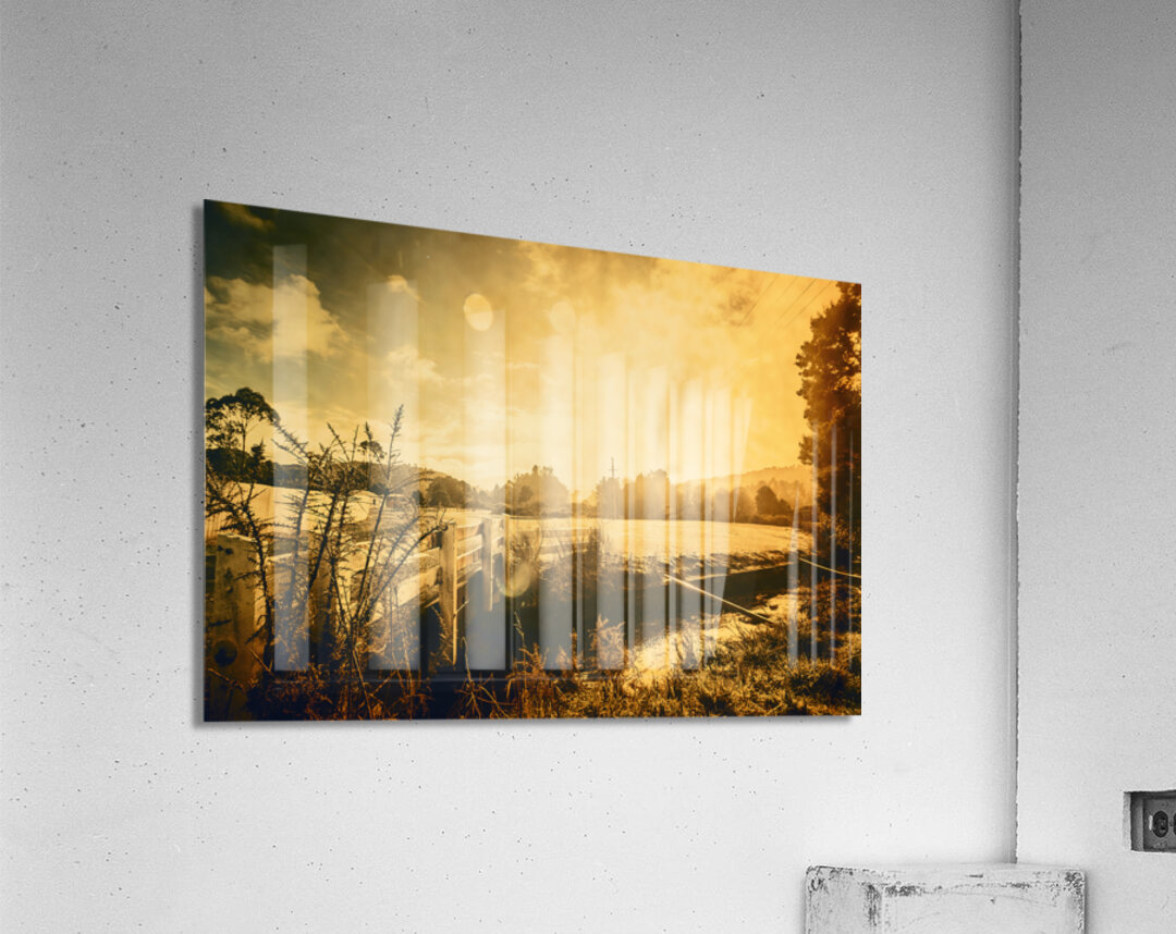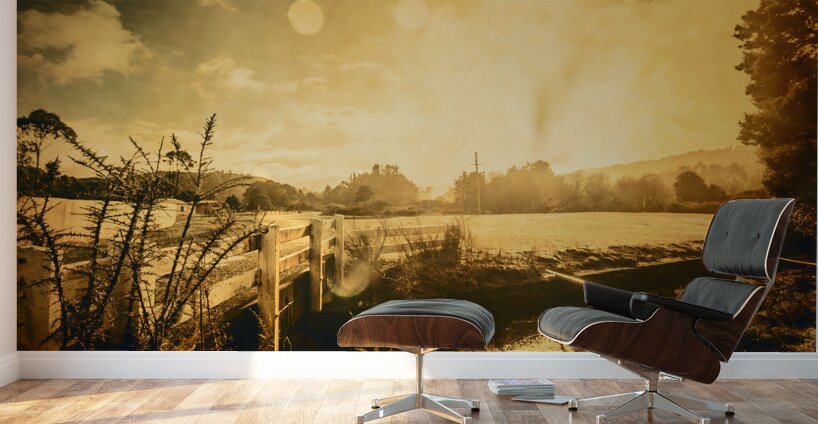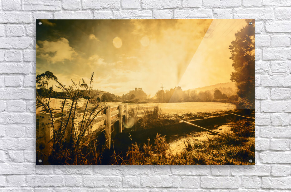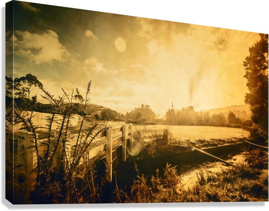 Harmonious sunrise landscape photo on a peaceful outback bridge meeting open farmland Taken Zeehan Western Tasmania Australia