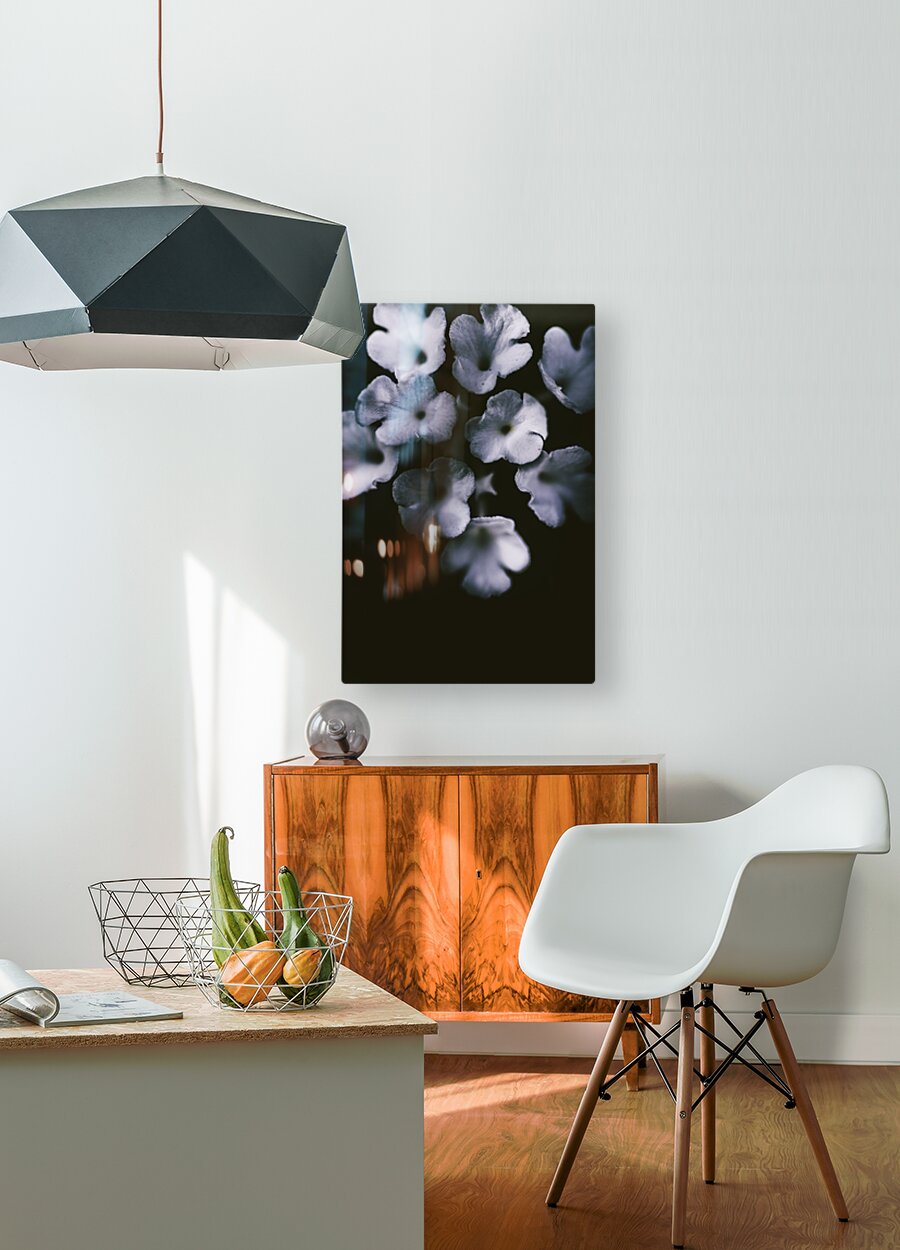 ABOUT THIS ARTWORK: ARTISTIC DARK BLUE FLOWERS IN NIGHT WINTER GARDEN