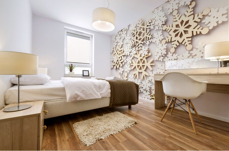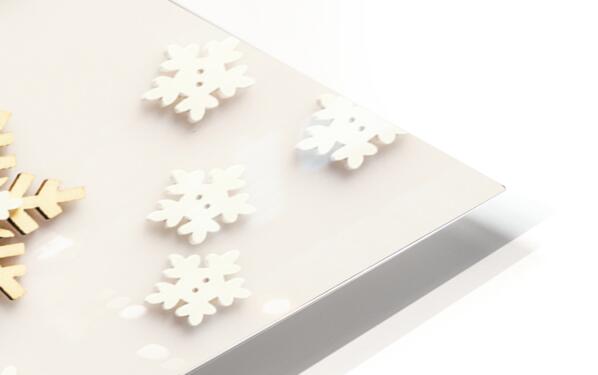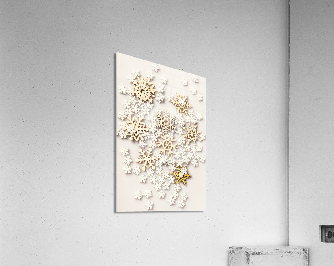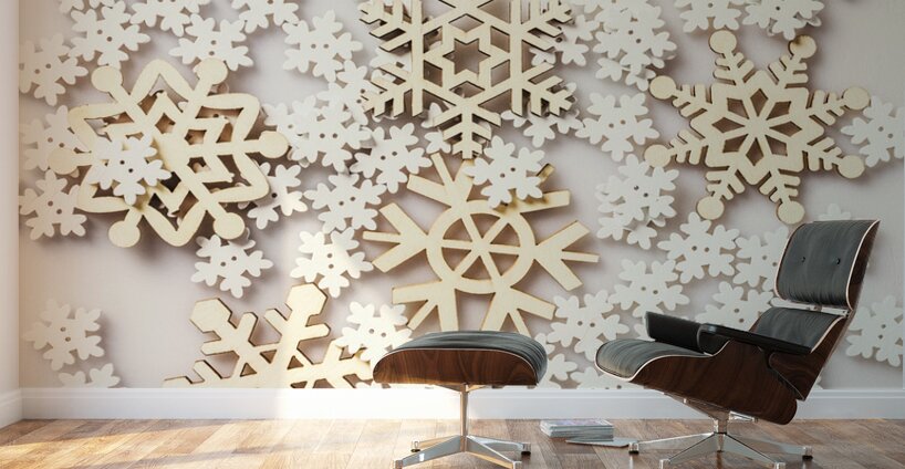 Modern winter abstract of wooden joy and icicle happiness with festive snowflakes seasoned on white background