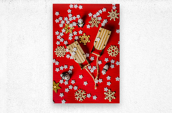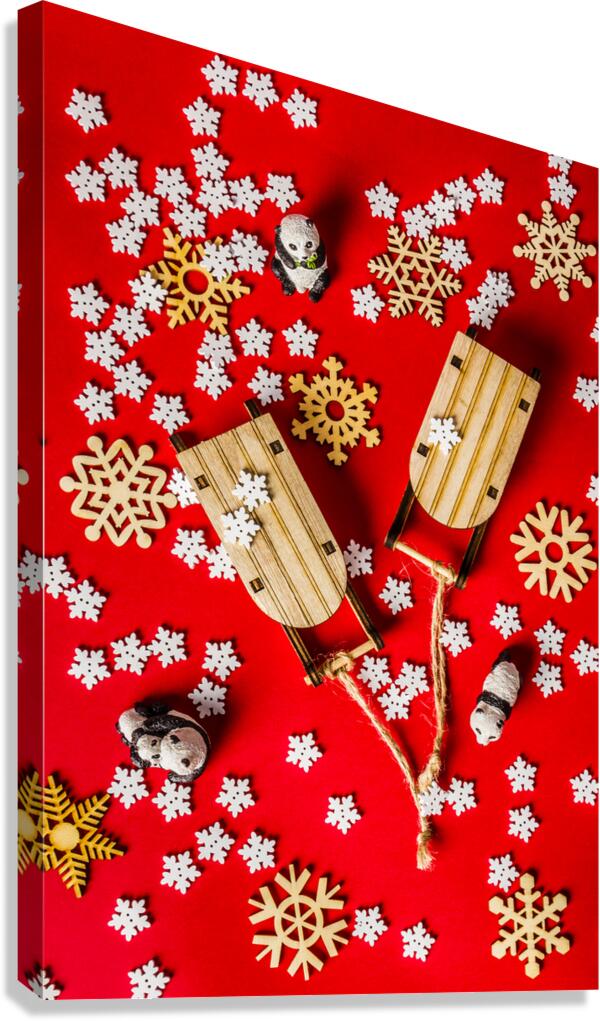Wintertime photography on a placement of toy pandas taking play to winter wonders with sleds and snowflakes on red background