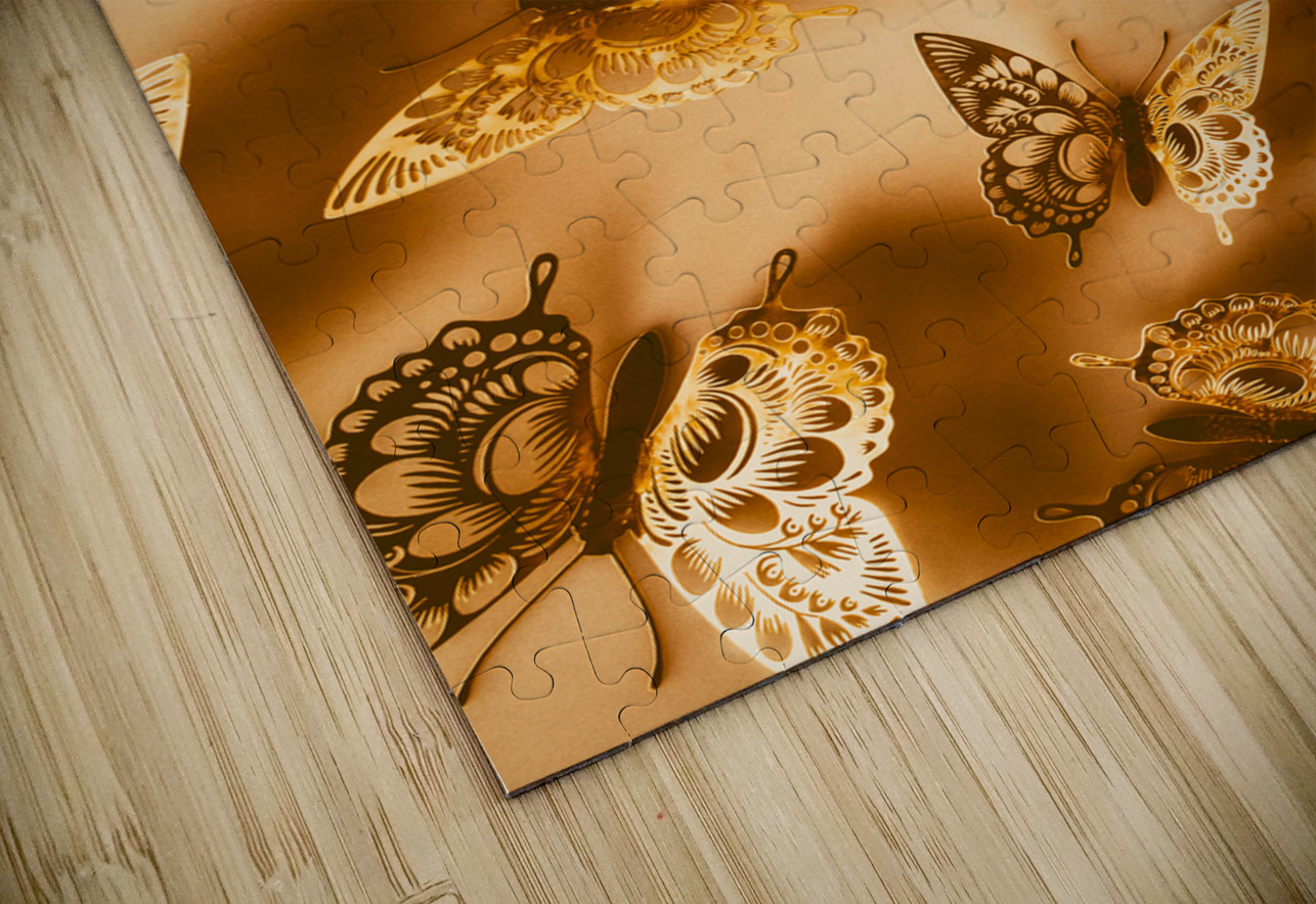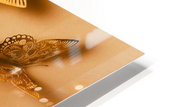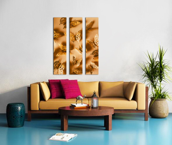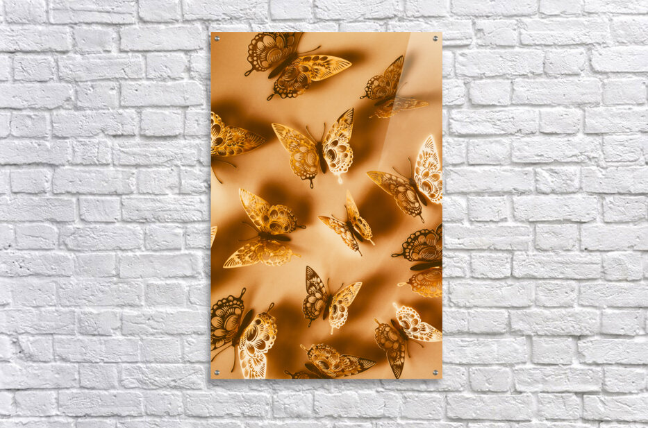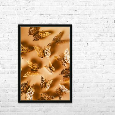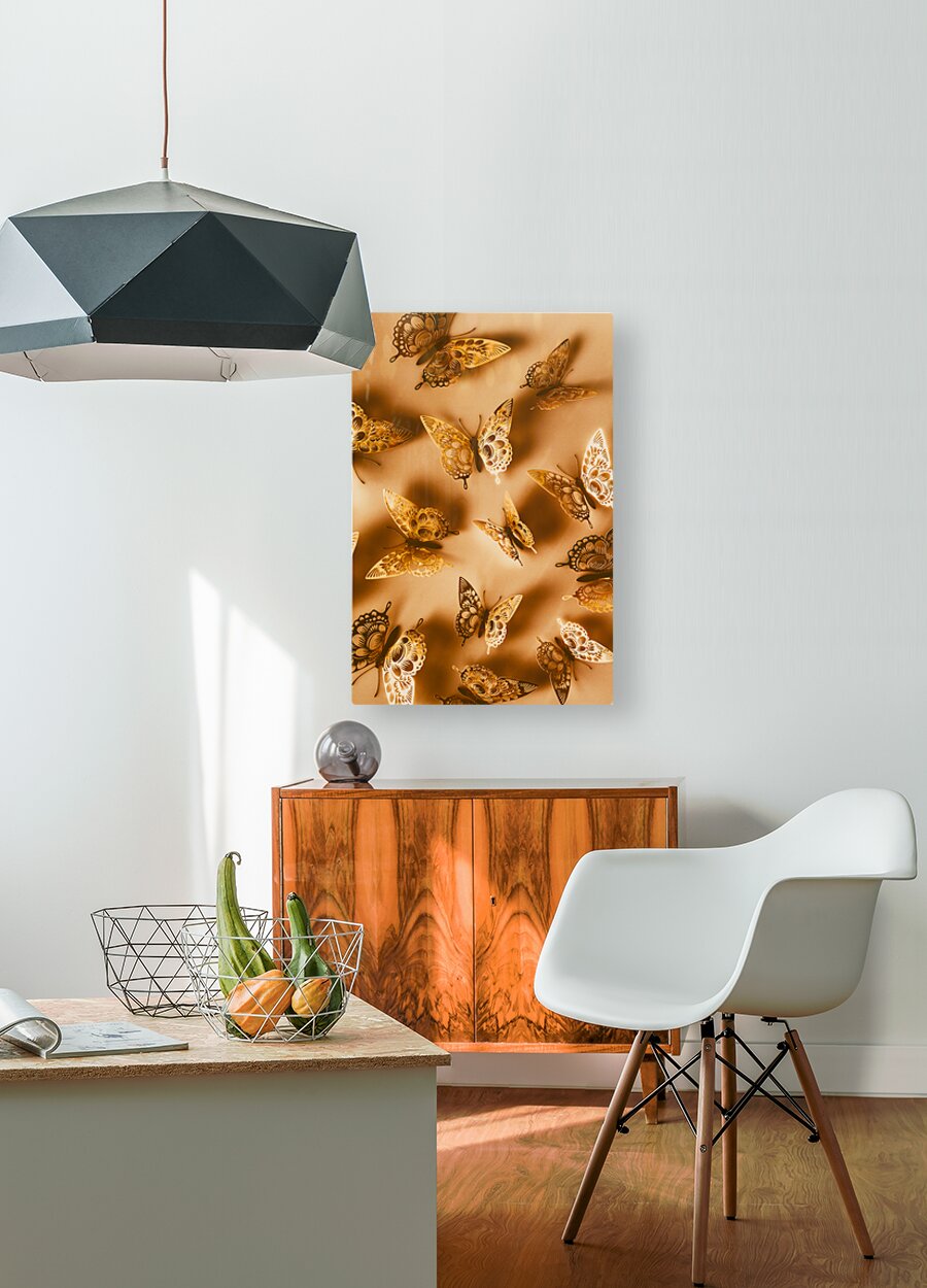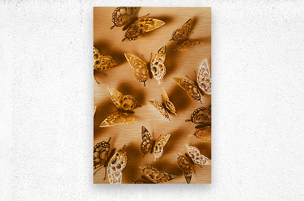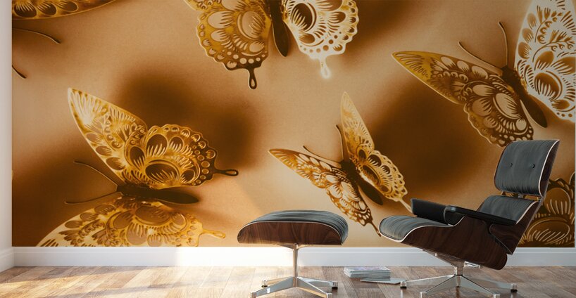 Whimsical wall art design on a shiny abstract of folded foil butterflies in dreamy decoration