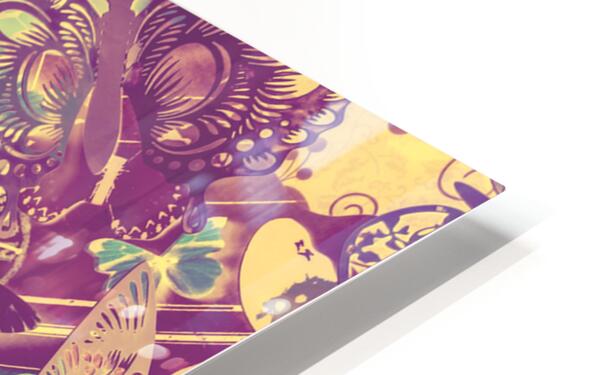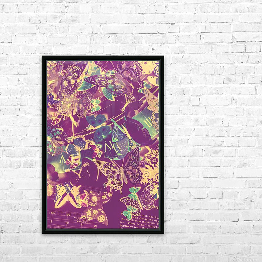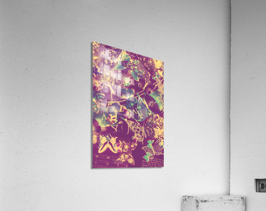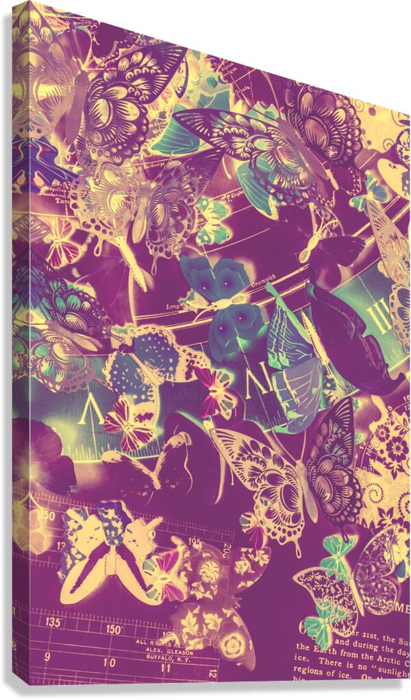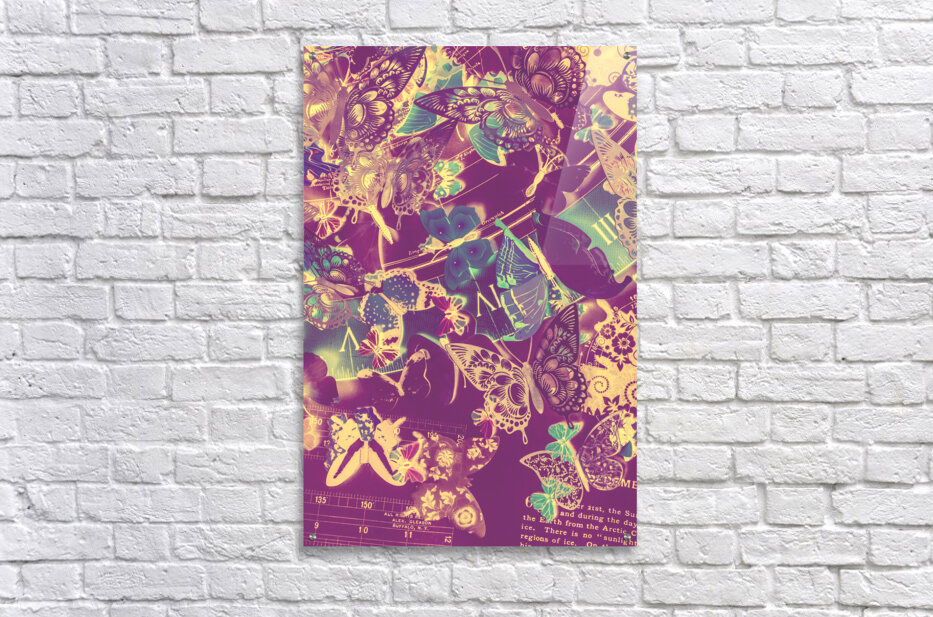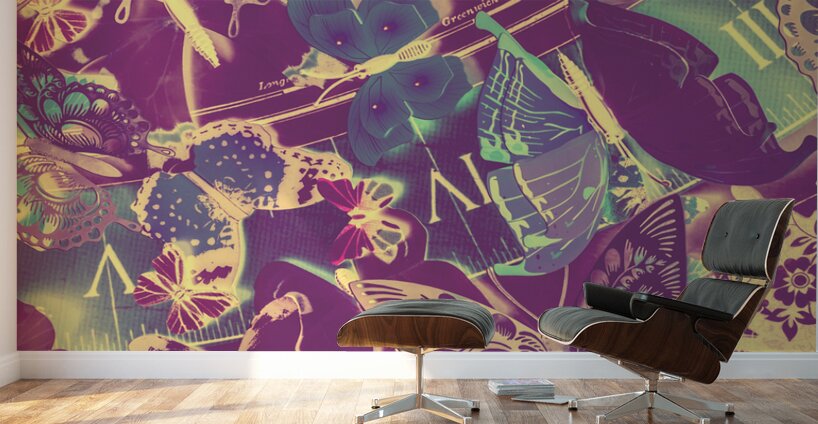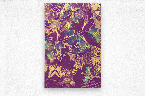 A vibrant colorful collage of butterfly wings is superimposed on a vintage map creating an abstract artistic composition. The wings are in various shades of purple pink green and yellow and they overlap and intersect in a chaotic but harmonious pattern.