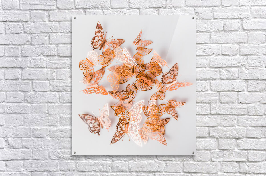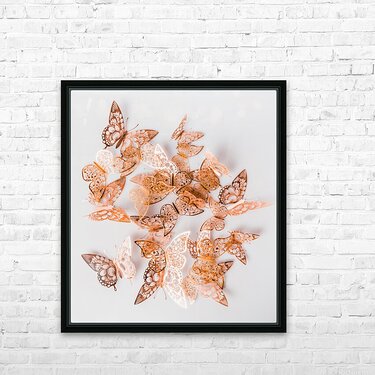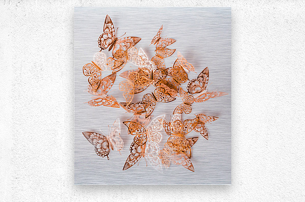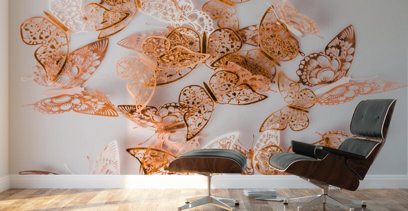 A cluster of delicate intricately-designed butterflies adorned with peach and gold hues rests on a pristine white surface. Their wings spread out in v...[+]