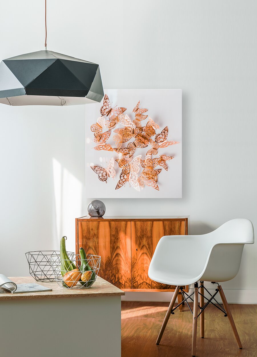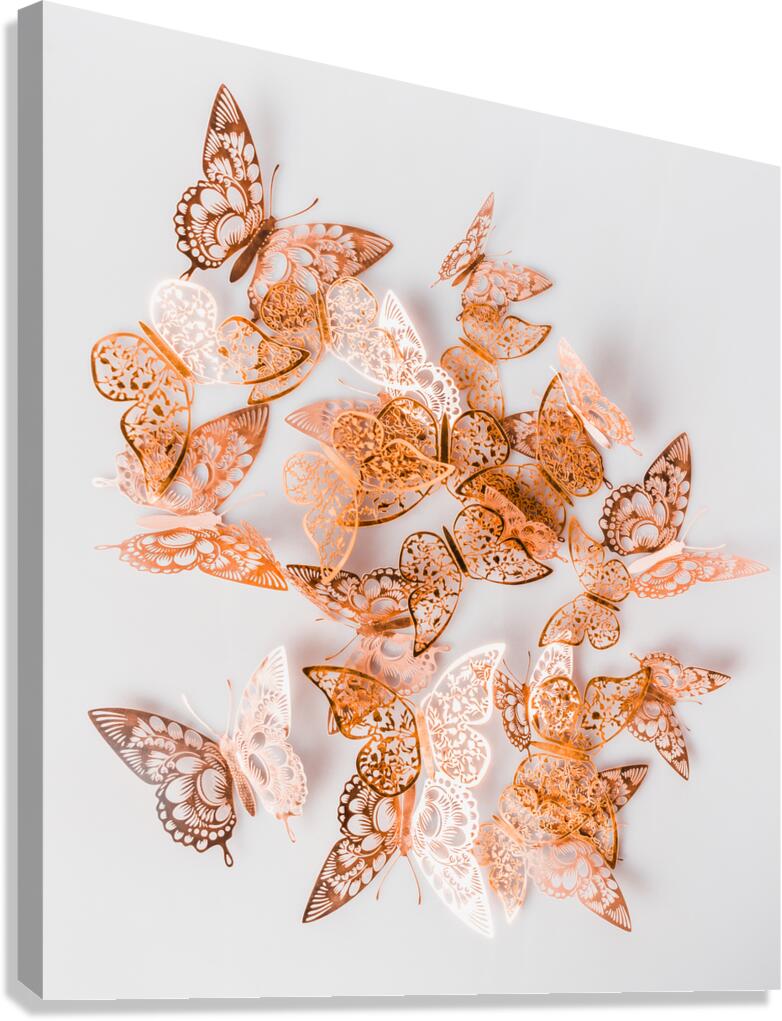 Get this artwork "A flurry of peach and gold butterflies" in a framed print.