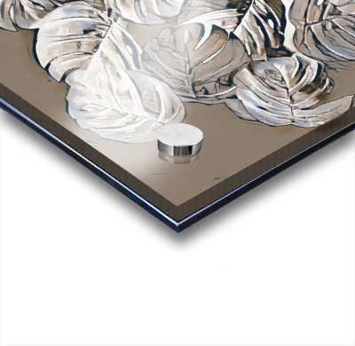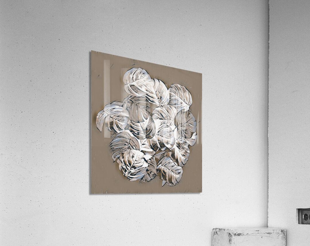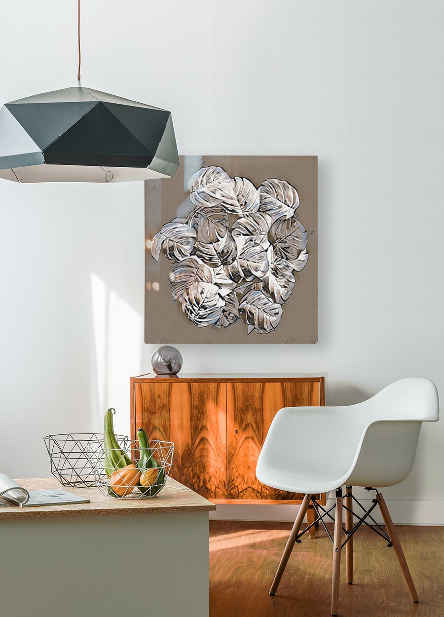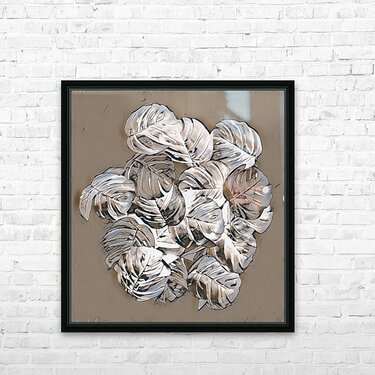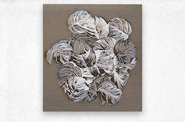 A group of Monstera leaves rendered in a silver and charcoal palette are layered on top of each other creating a sense of depth and texture. Light pla...[+]