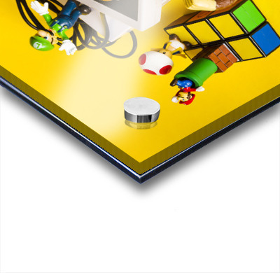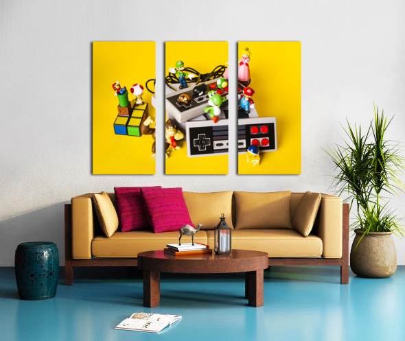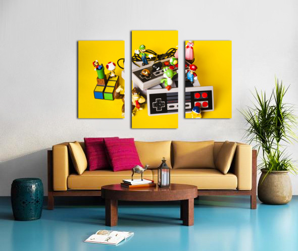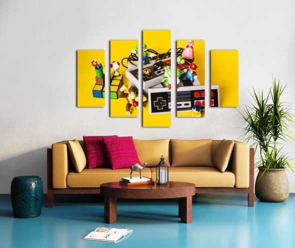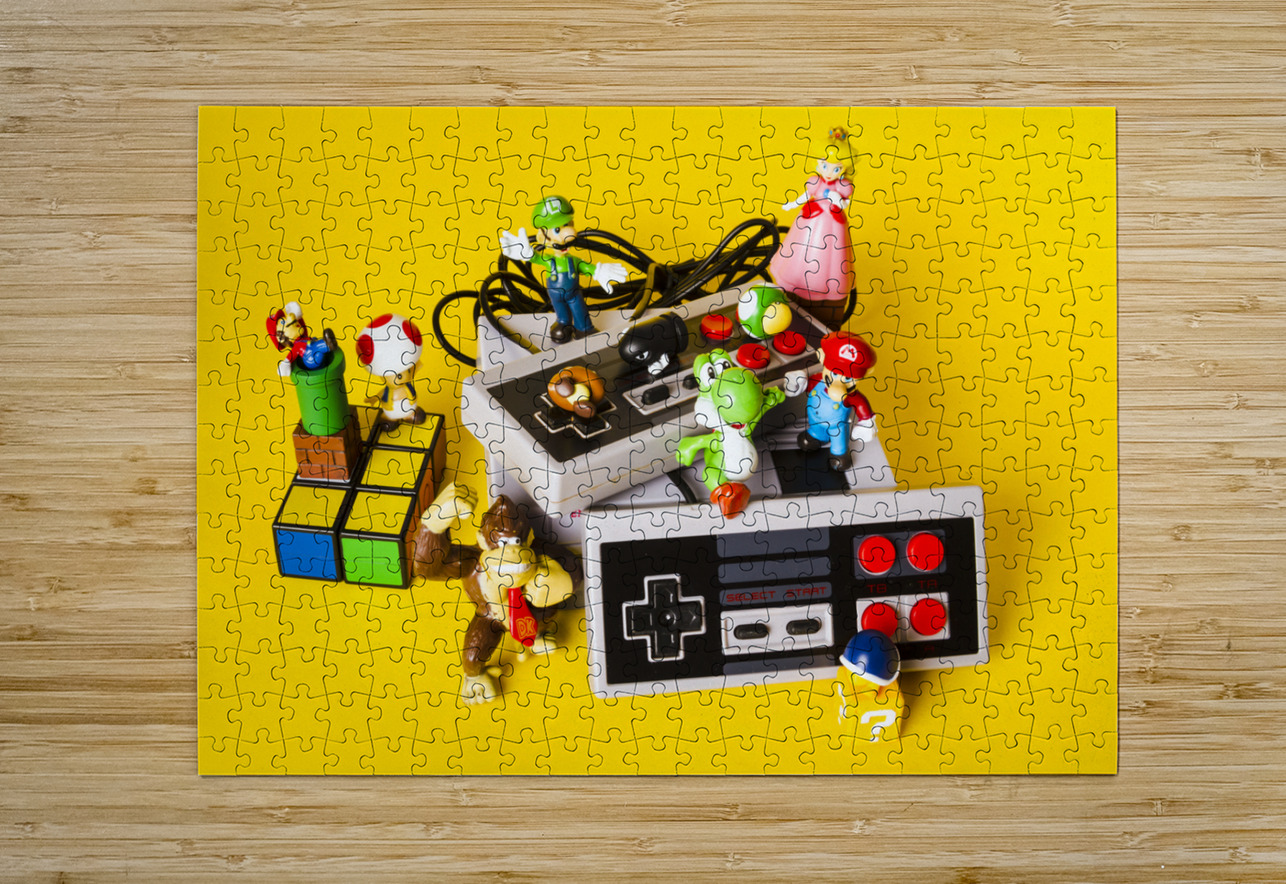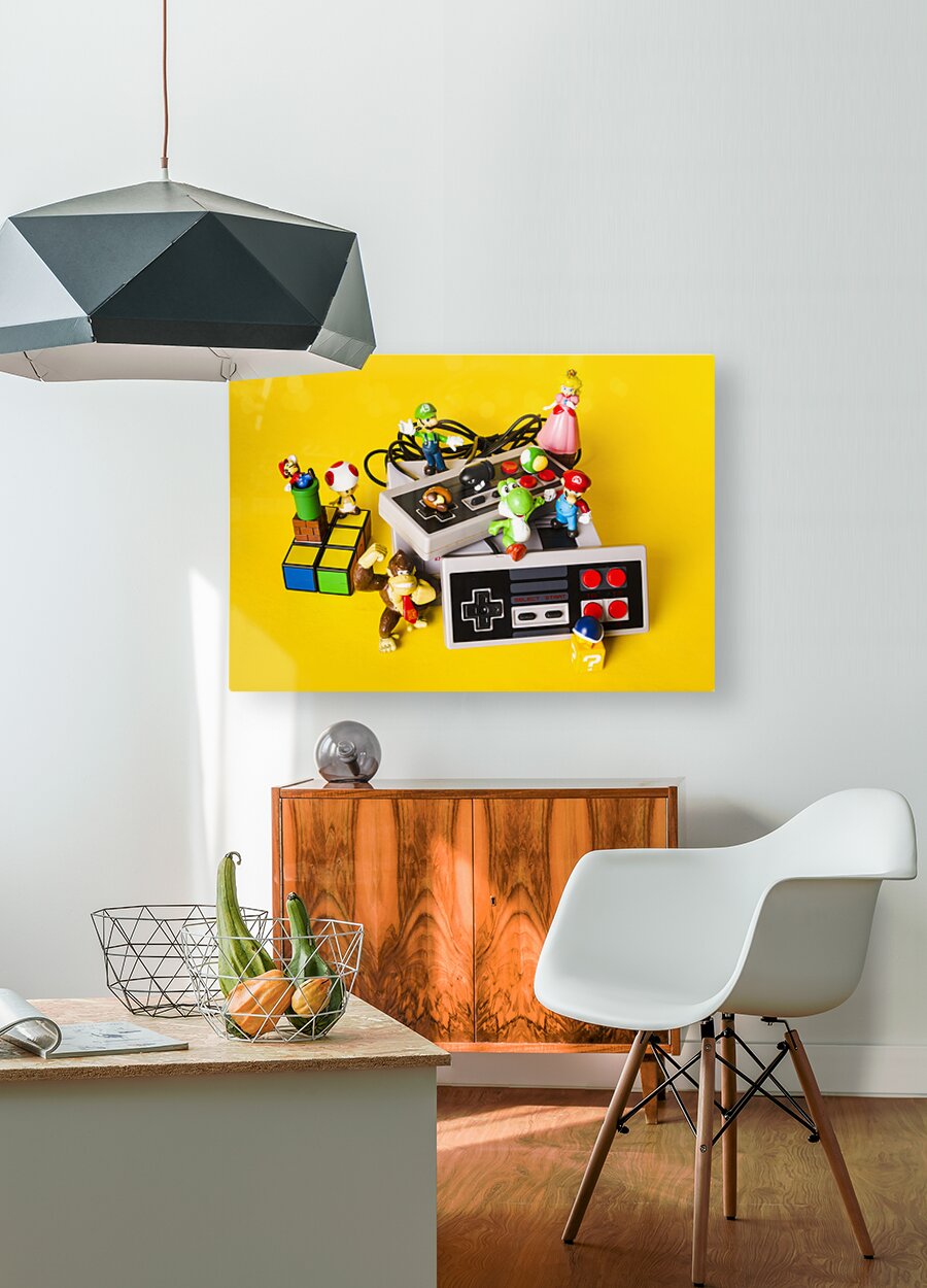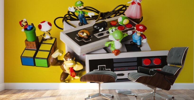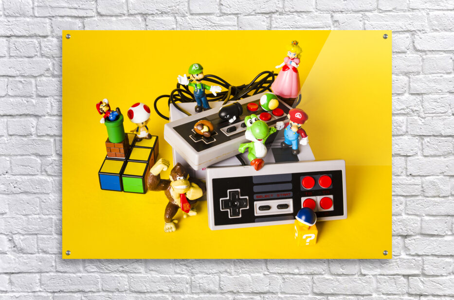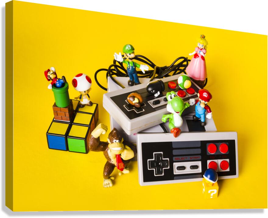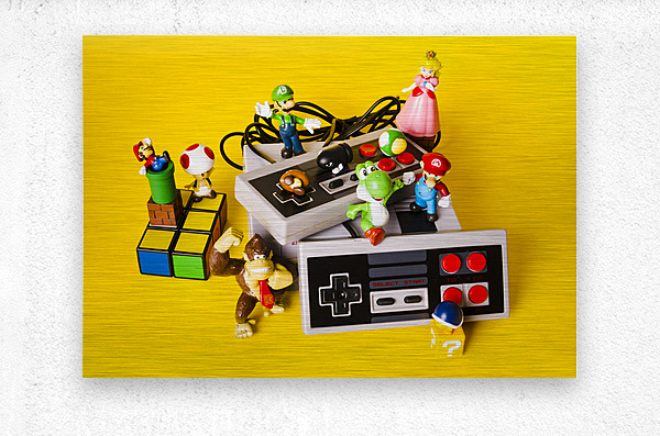 A collection of classic video game characters and a question mark blocks, stand atop and around two vintage video game controllers on a vibrant yellow...[+]