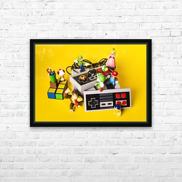A collection of classic video game characters and a question mark blocks, stand atop and around two vintage video game controllers on a vibrant yellow background. The figures are arranged in a playful composition, evoking memories of childhood gaming and the iconic worlds of arcade.