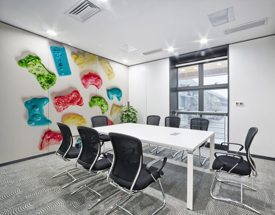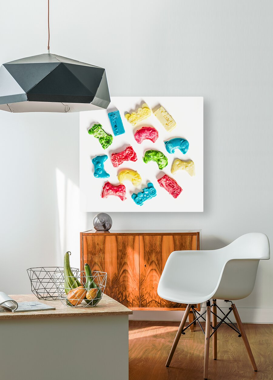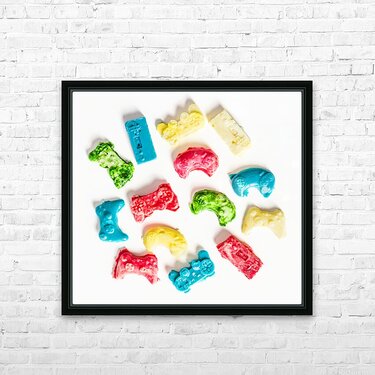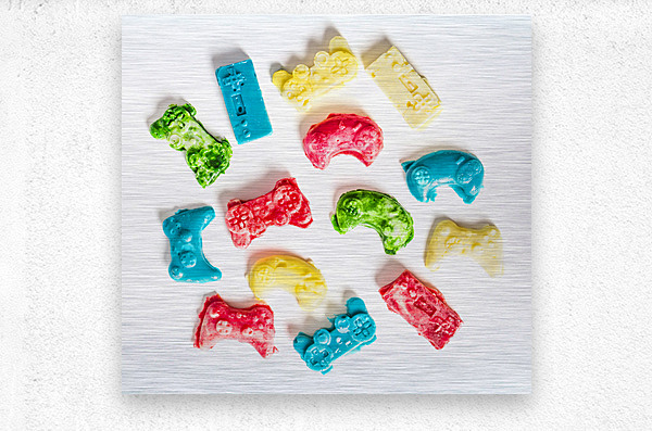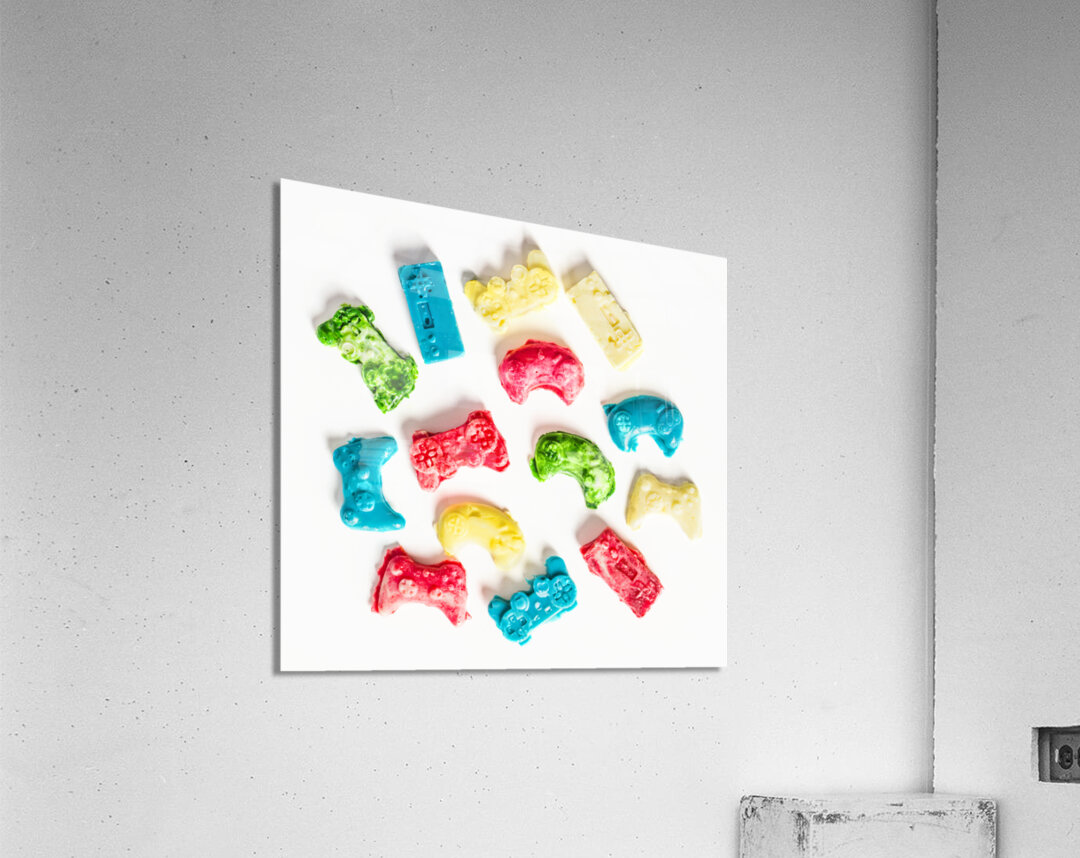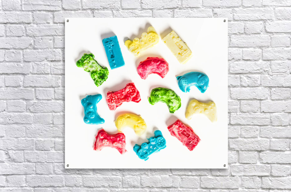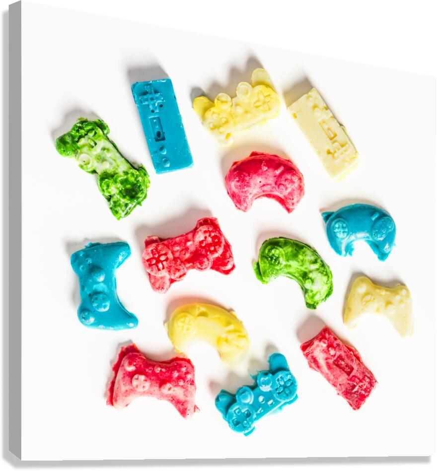 A collection of brightly colored game controller-shaped treats are arranged on a white surface. The treats are made in various shades of red blue gree...[+]