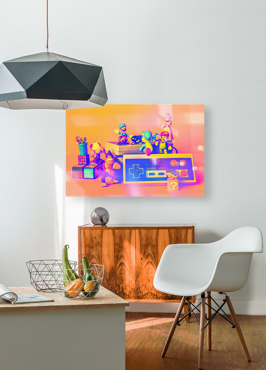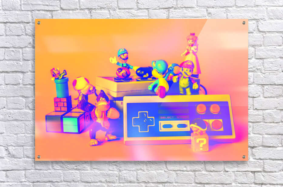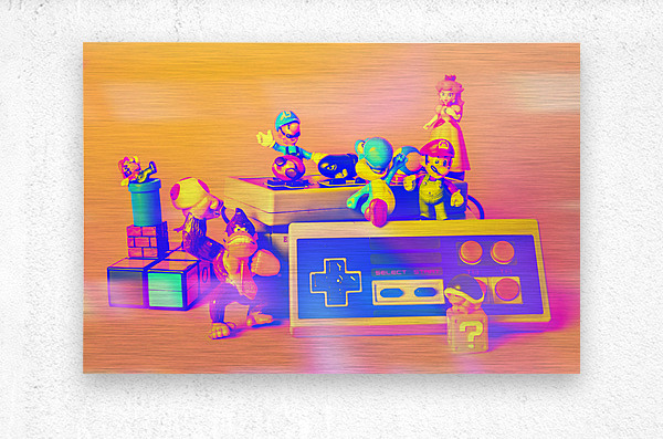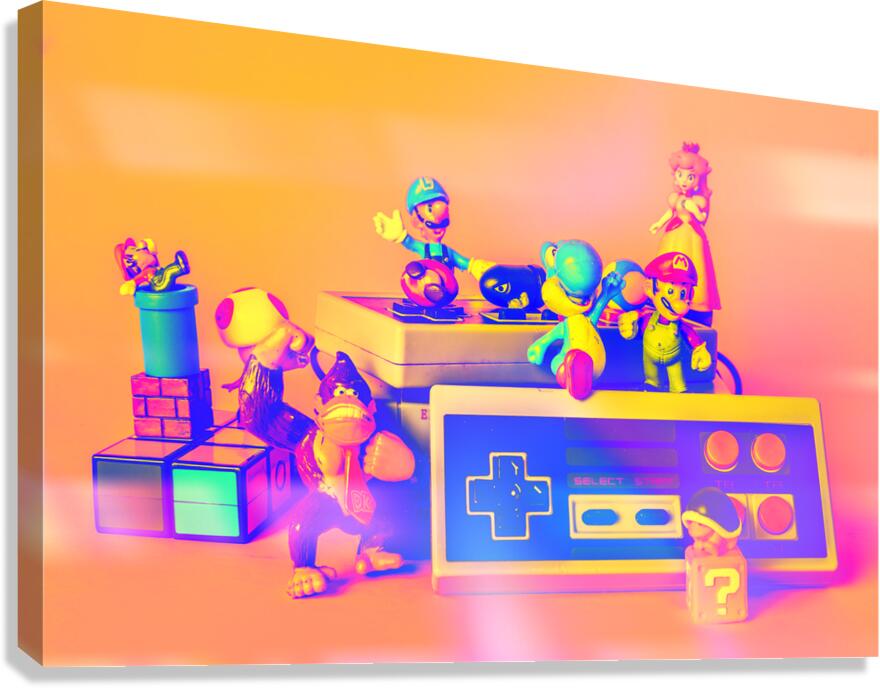 A group of beloved video game characters are gathered around a vintage game console ready to jump into a world of pixelated adventure.