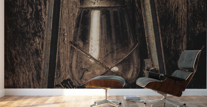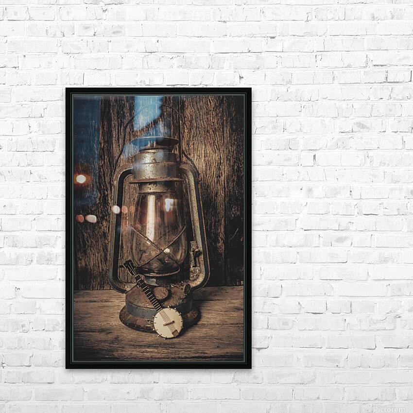 A weathered oil lamp sits in front of a rustic wooden background with a small banjo resting beside it. The lamps metal is faded and shows signs of use...[+]