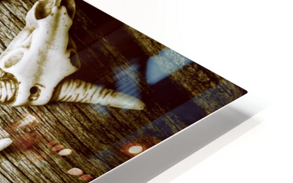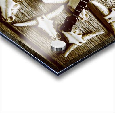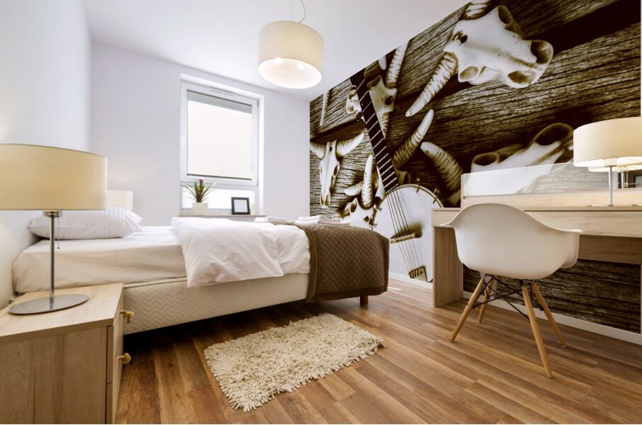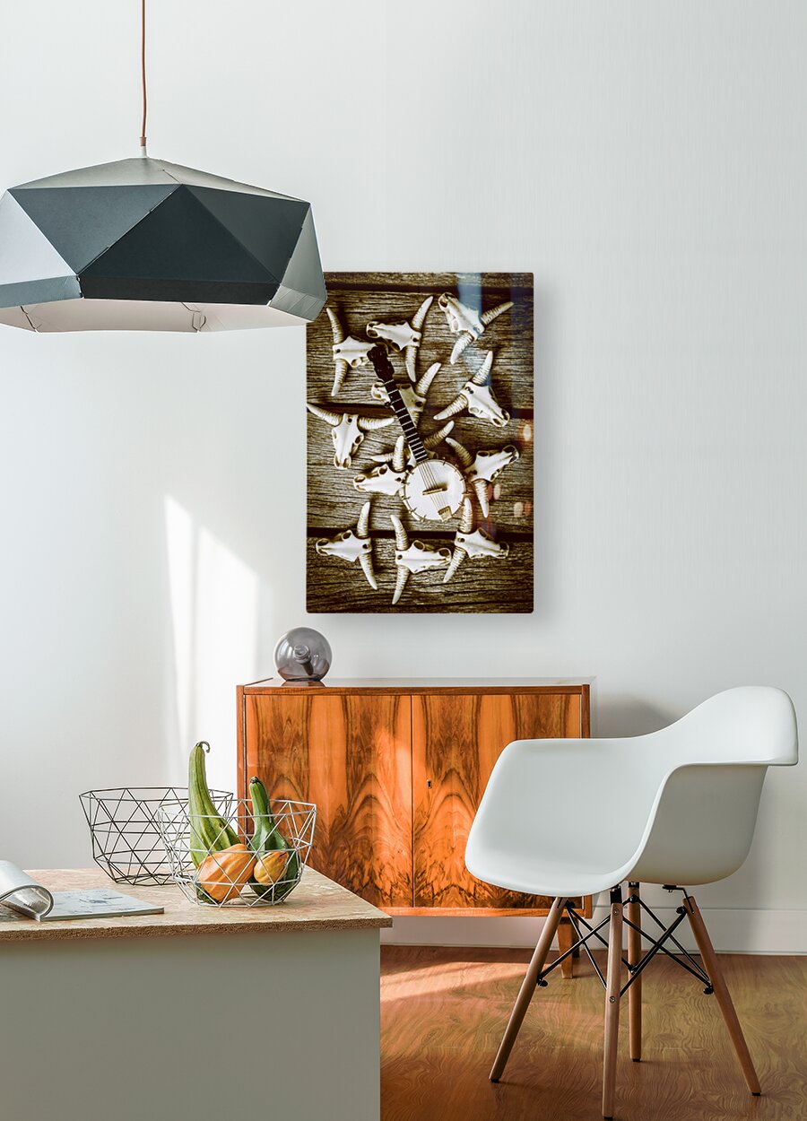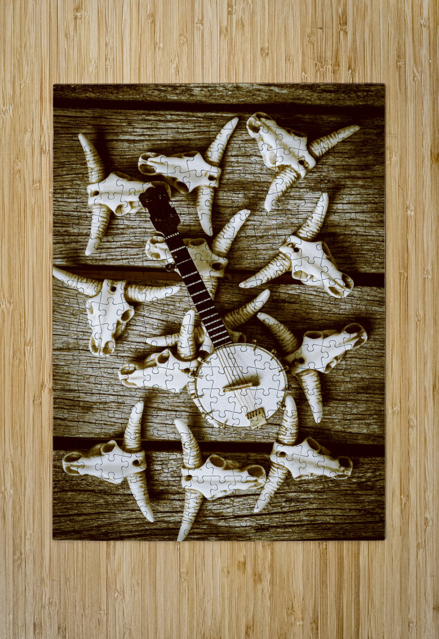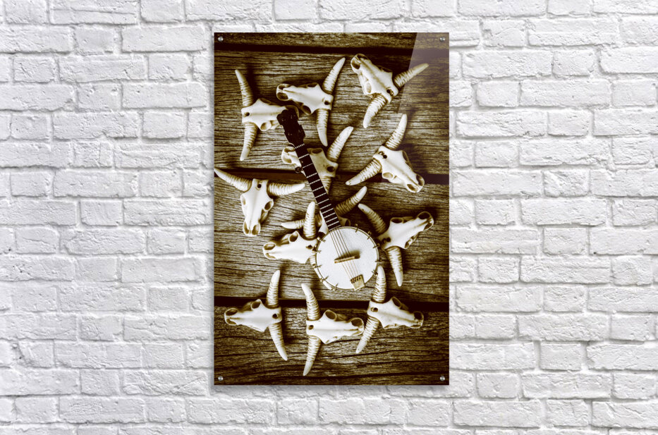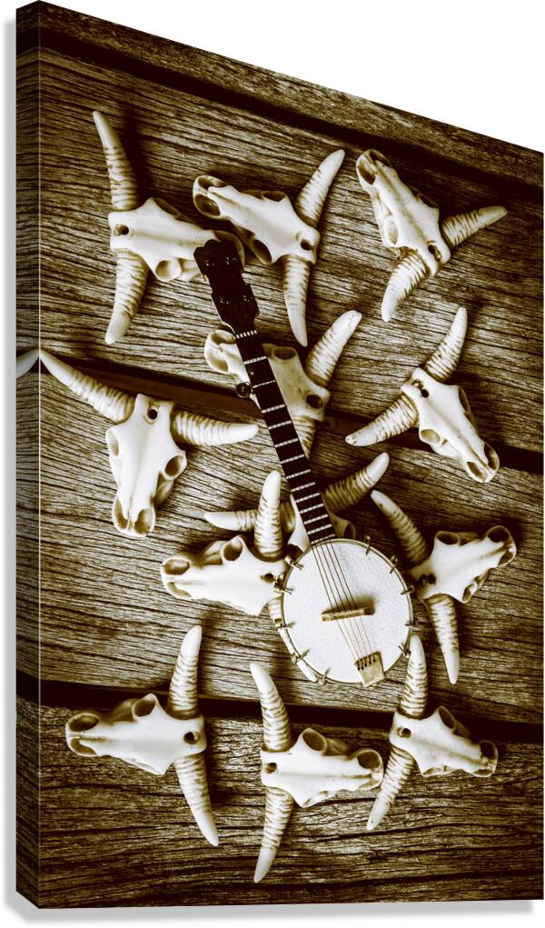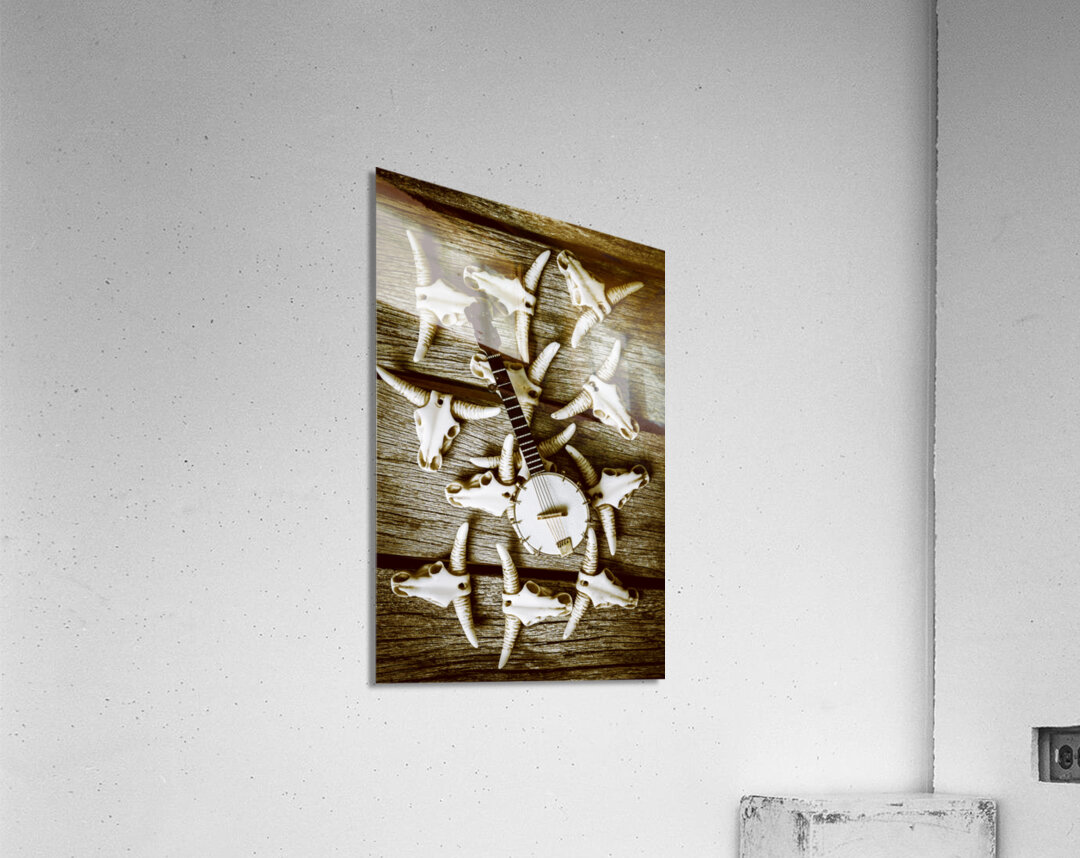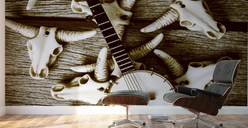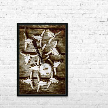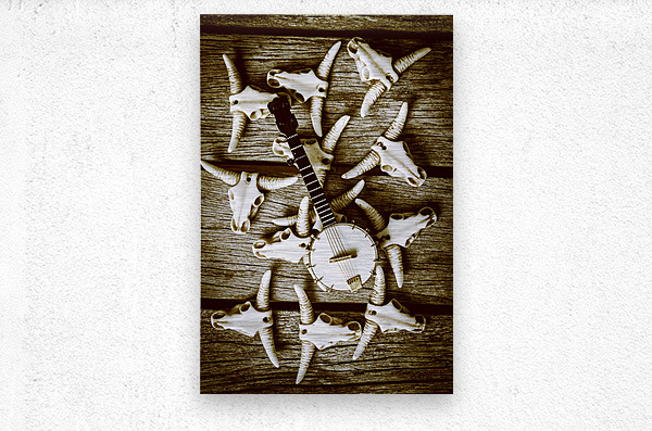 A rustic music scene with weathered cattle skulls and banjo guitar playing up a country scene