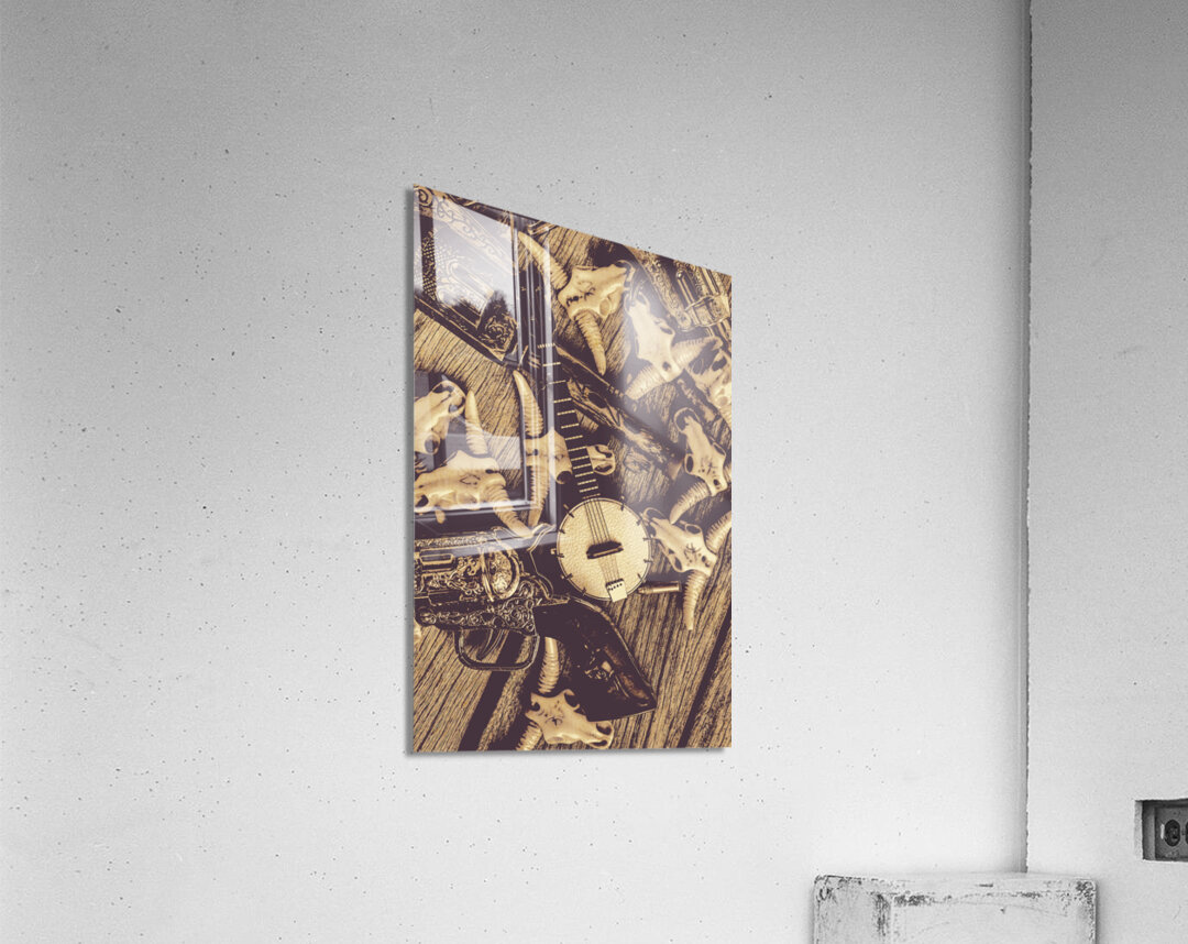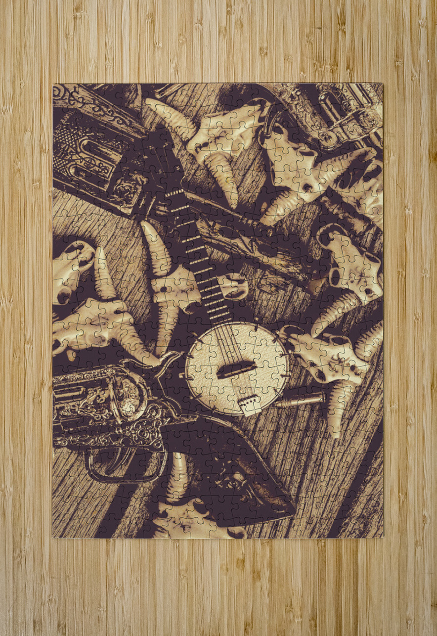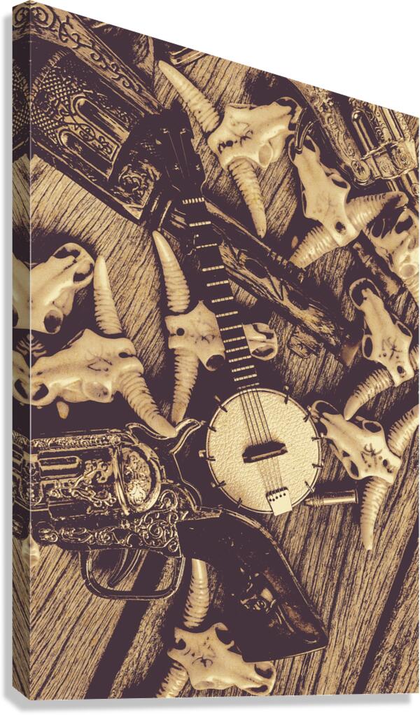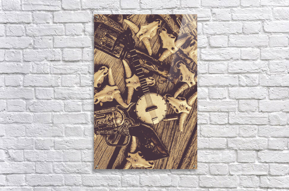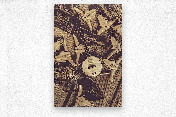 A vintage banjo rests on a wooden surface surrounded by a collection of stylized animal skulls and a decorative pistol. The composition creates a rust...[+]