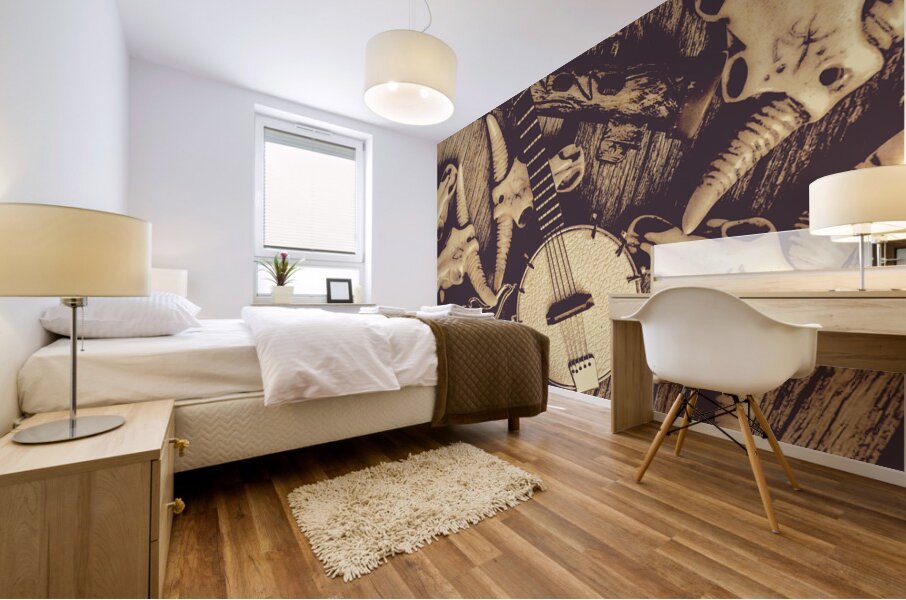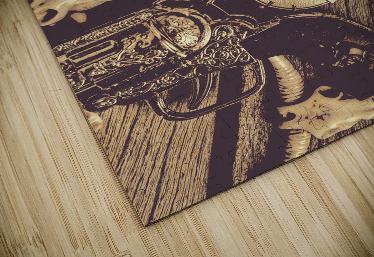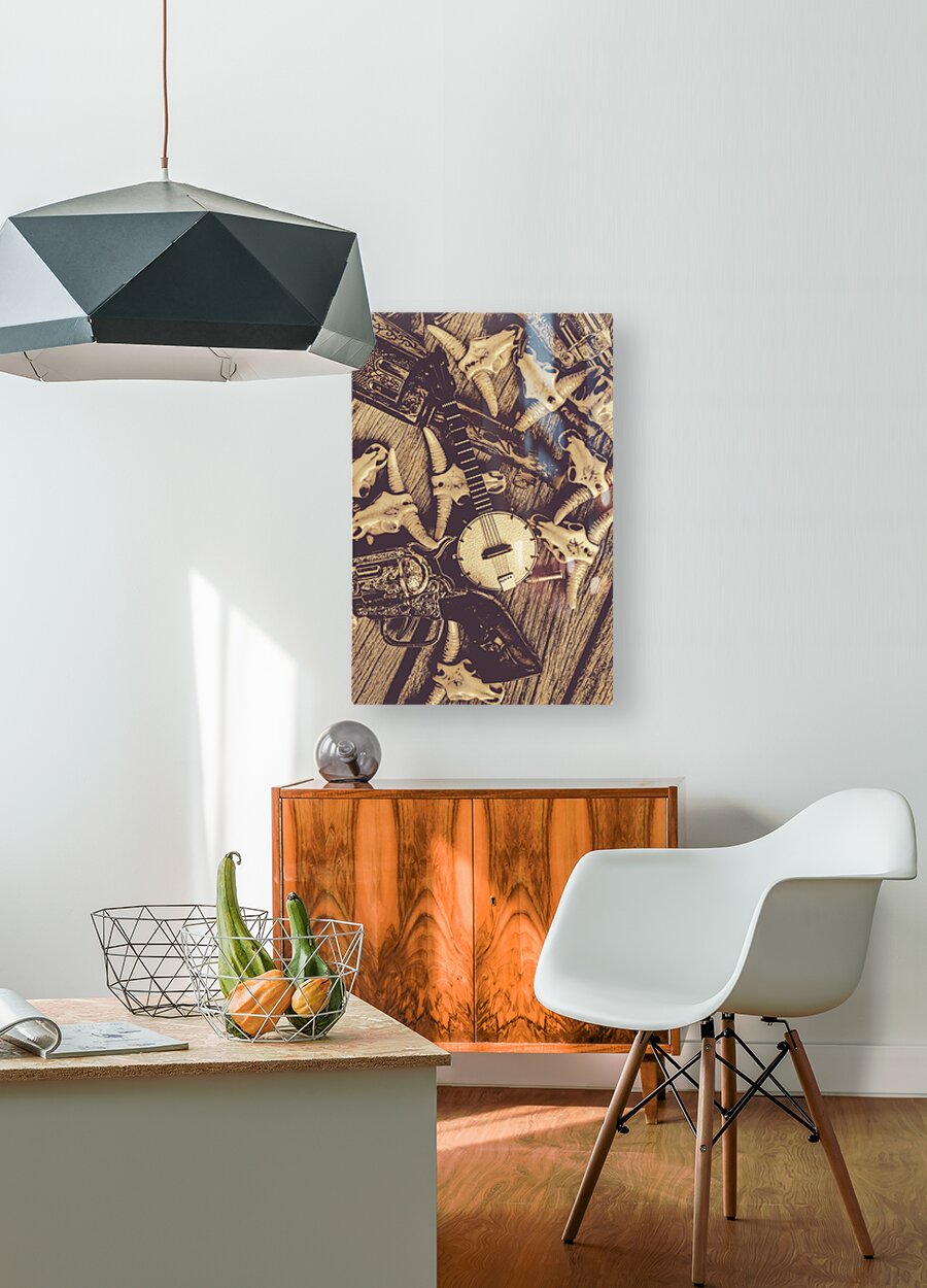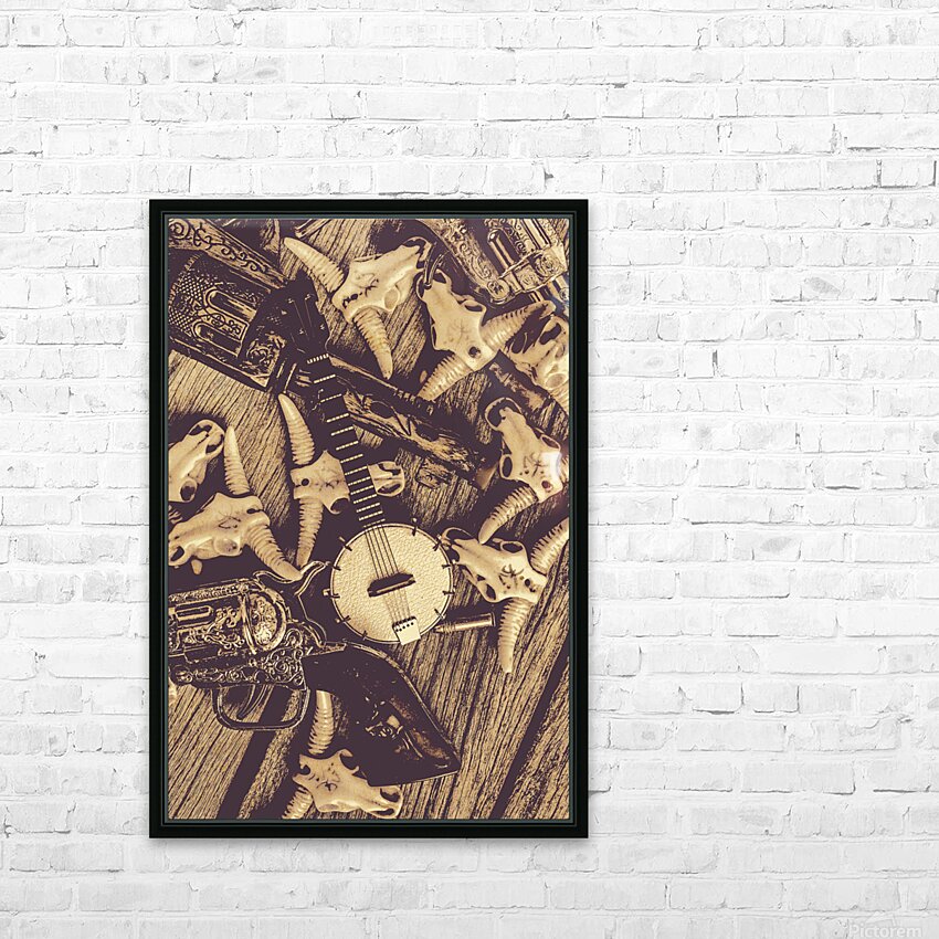 A vintage banjo rests on a wooden surface surrounded by a collection of stylized animal skulls and a decorative pistol. The composition creates a rust...[+]