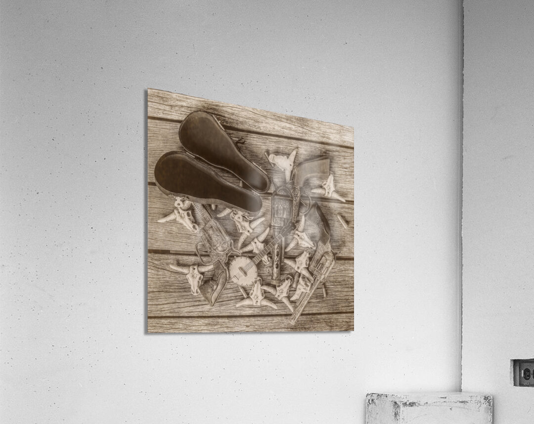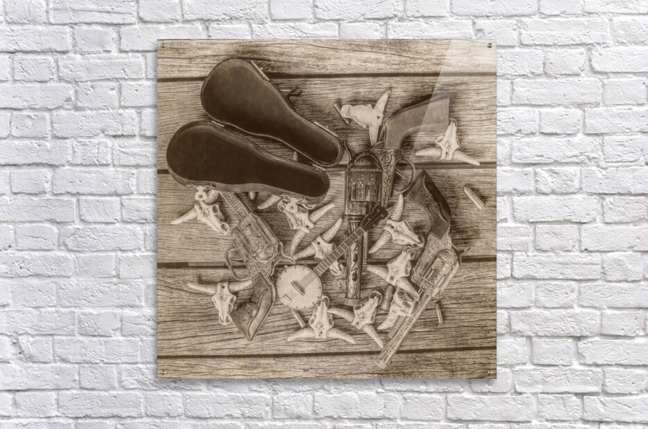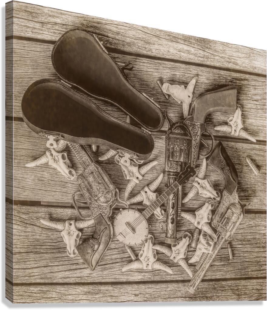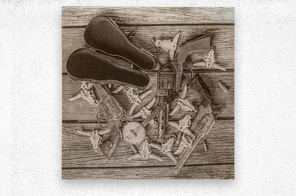 A sepia-toned photograph depicting a collection of western artifacts including two pistols a banjo and a pair of leather cases carefully arranged on a worn wooden surface. The composition includes several small decorative cow skulls adding a touch of rustic charm to the scene.