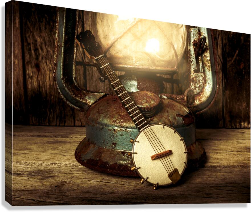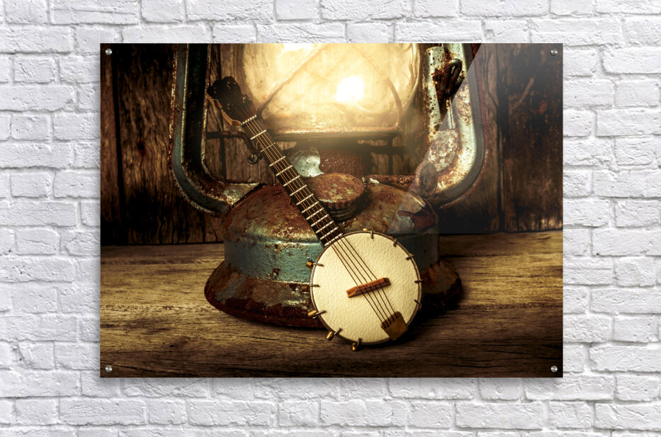 A weathered banjo lies on a wooden surface next to a rusty antique lantern. The lanterns light casts a warm glow on the scene illuminating the banjos ...[+]
