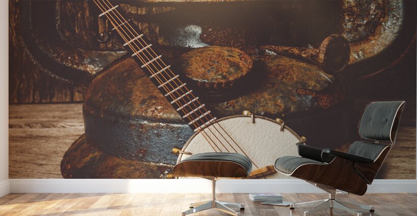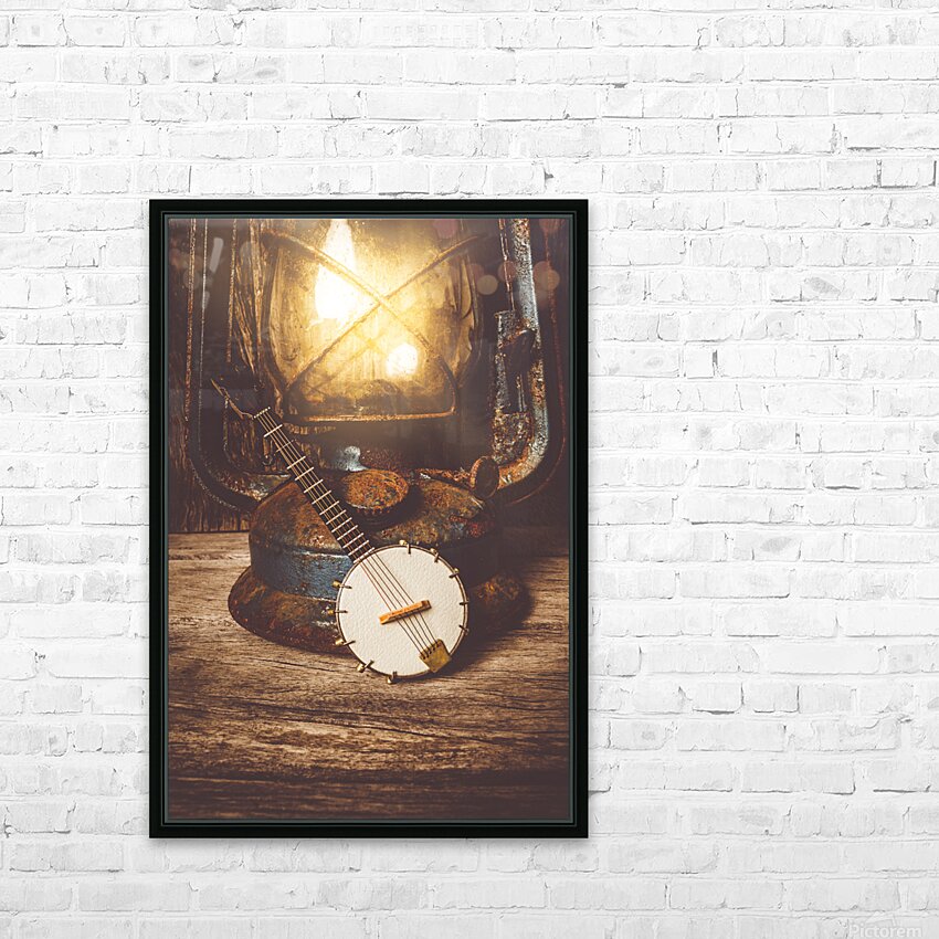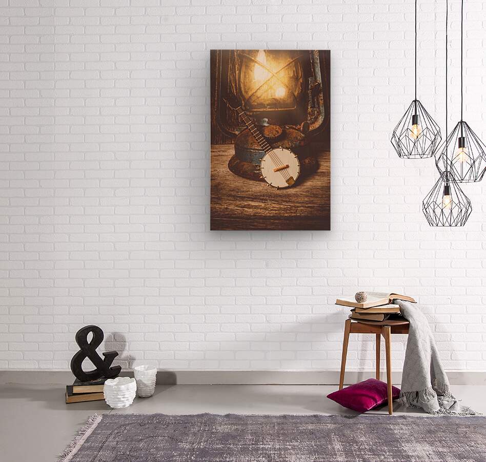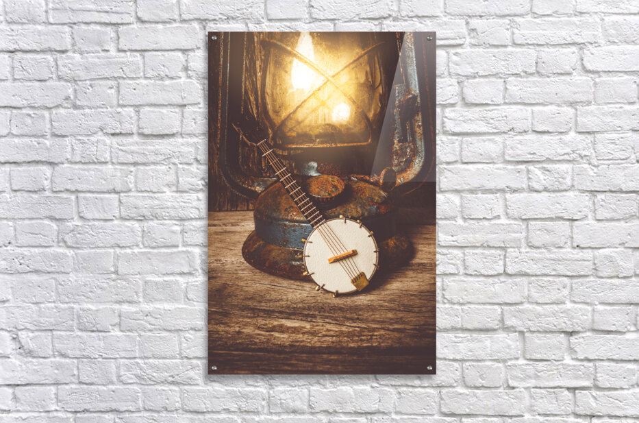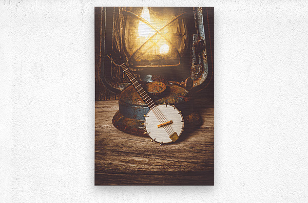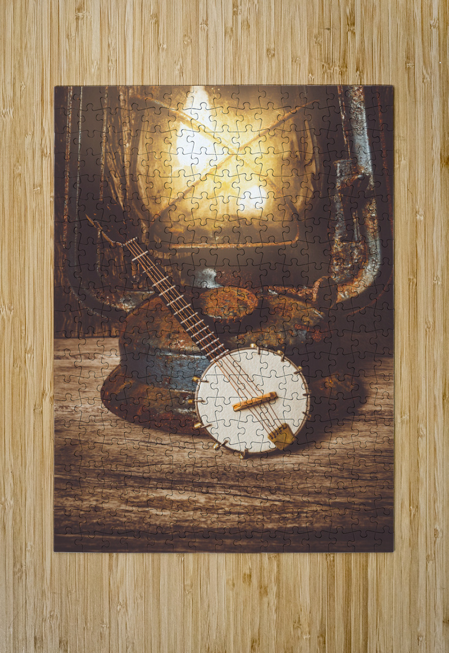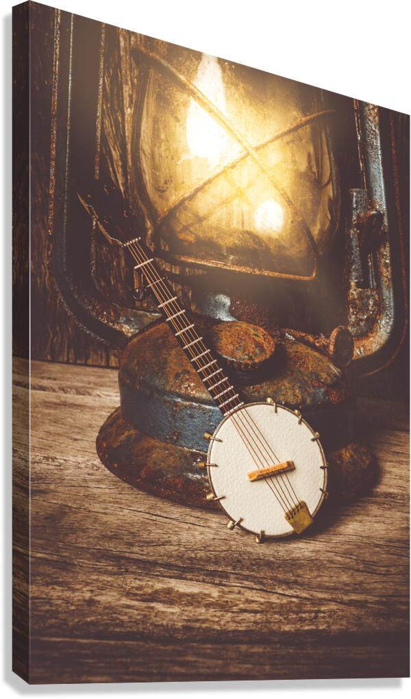 A small banjo lies beside an old rusty lantern on a weathered wooden surface. The lantern is lit casting a warm glow on the banjo and the surrounding ...[+]