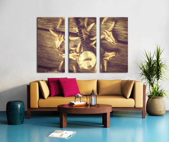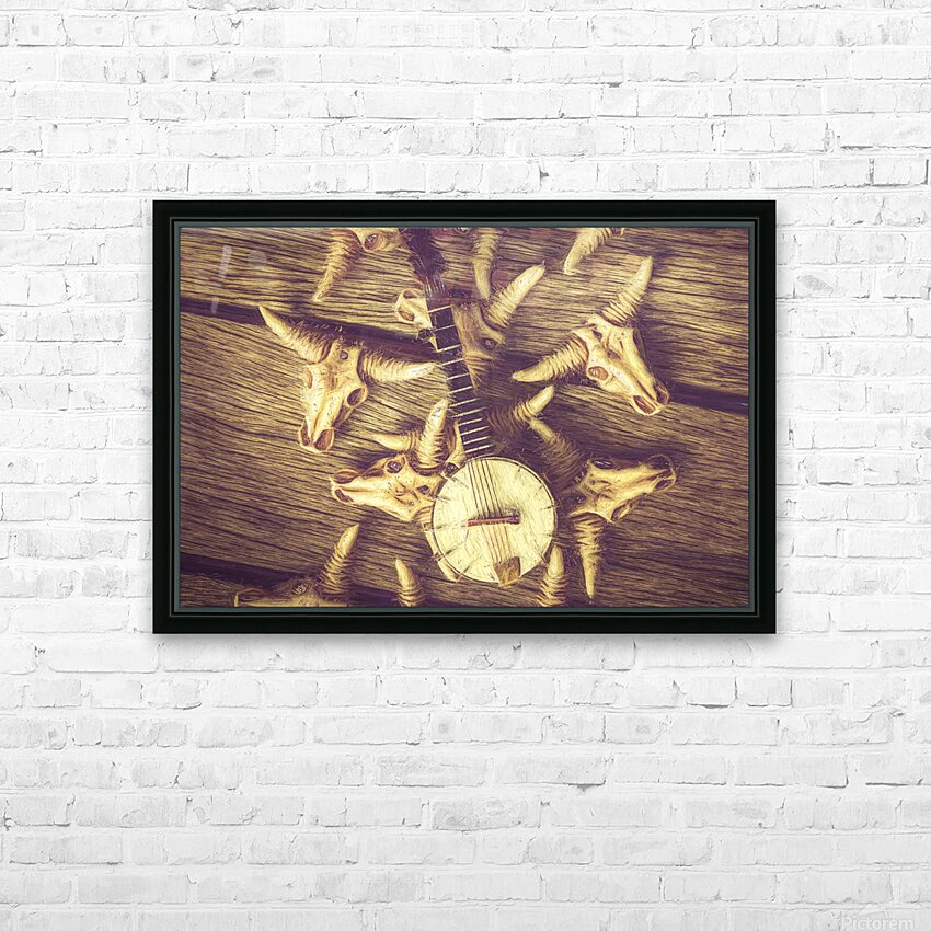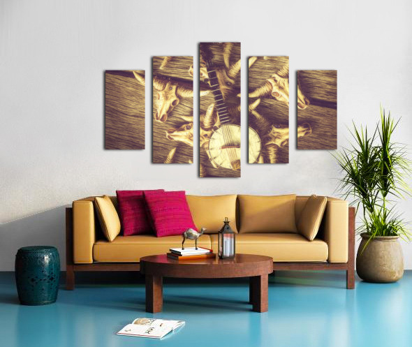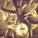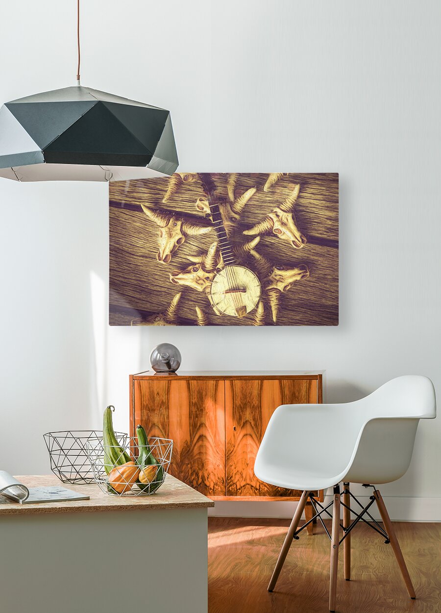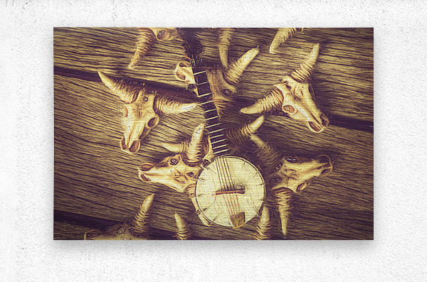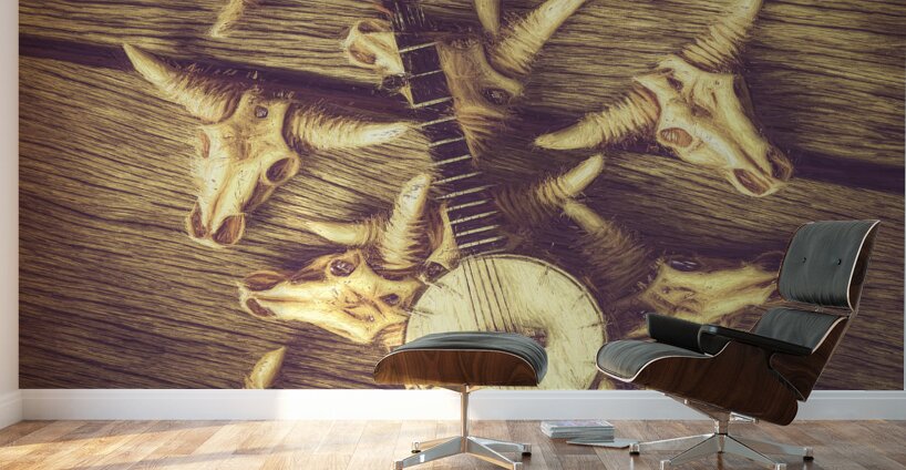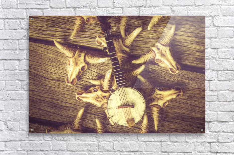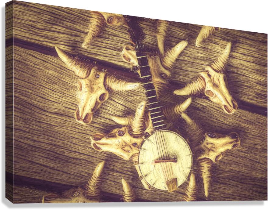 A traditional country still-life on banjo guitar and bull skulls in old wild west musical fashion