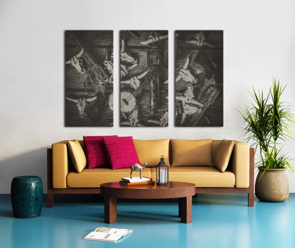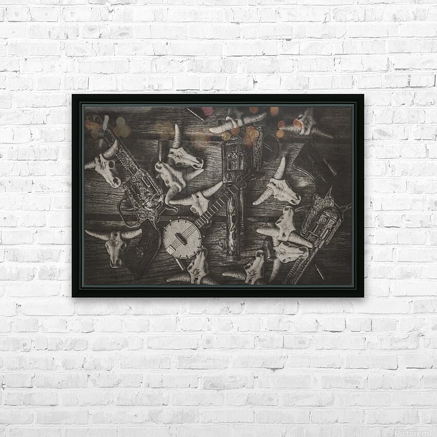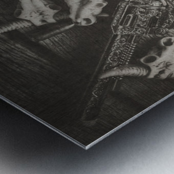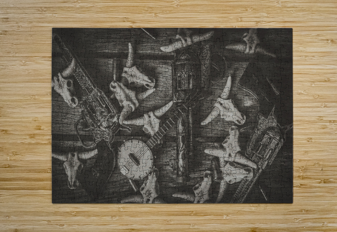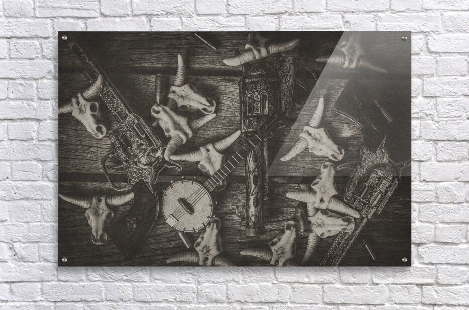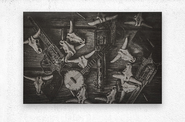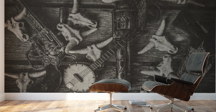 A collection of antique Western paraphernalia including a banjo a gun and numerous animal skulls lay scattered on a rustic wooden surface. The objects are arranged in an artistic manner creating a sense of old-fashioned nostalgia and a hint of danger. The black and white tone of the image adds a timeless quality.
