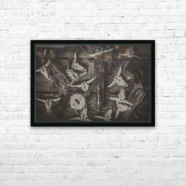 A collection of antique Western paraphernalia including a banjo a gun and numerous animal skulls lay scattered on a rustic wooden surface. The objects...[+]