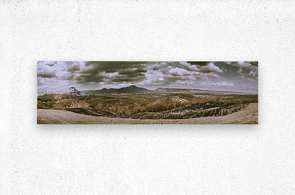 A panoramic view of Mount Perry taken 23rd November 2023 after a long dry period followed by fires in Queensland Australia with a vast expanse of dry parched land stretching out towards the horizon. The sky is filled with dark brooding clouds casting an ominous shadow over the landscape.