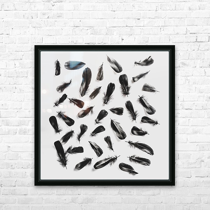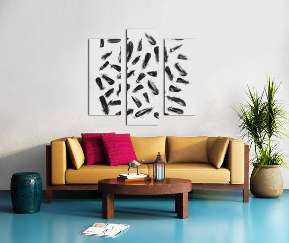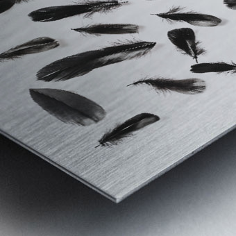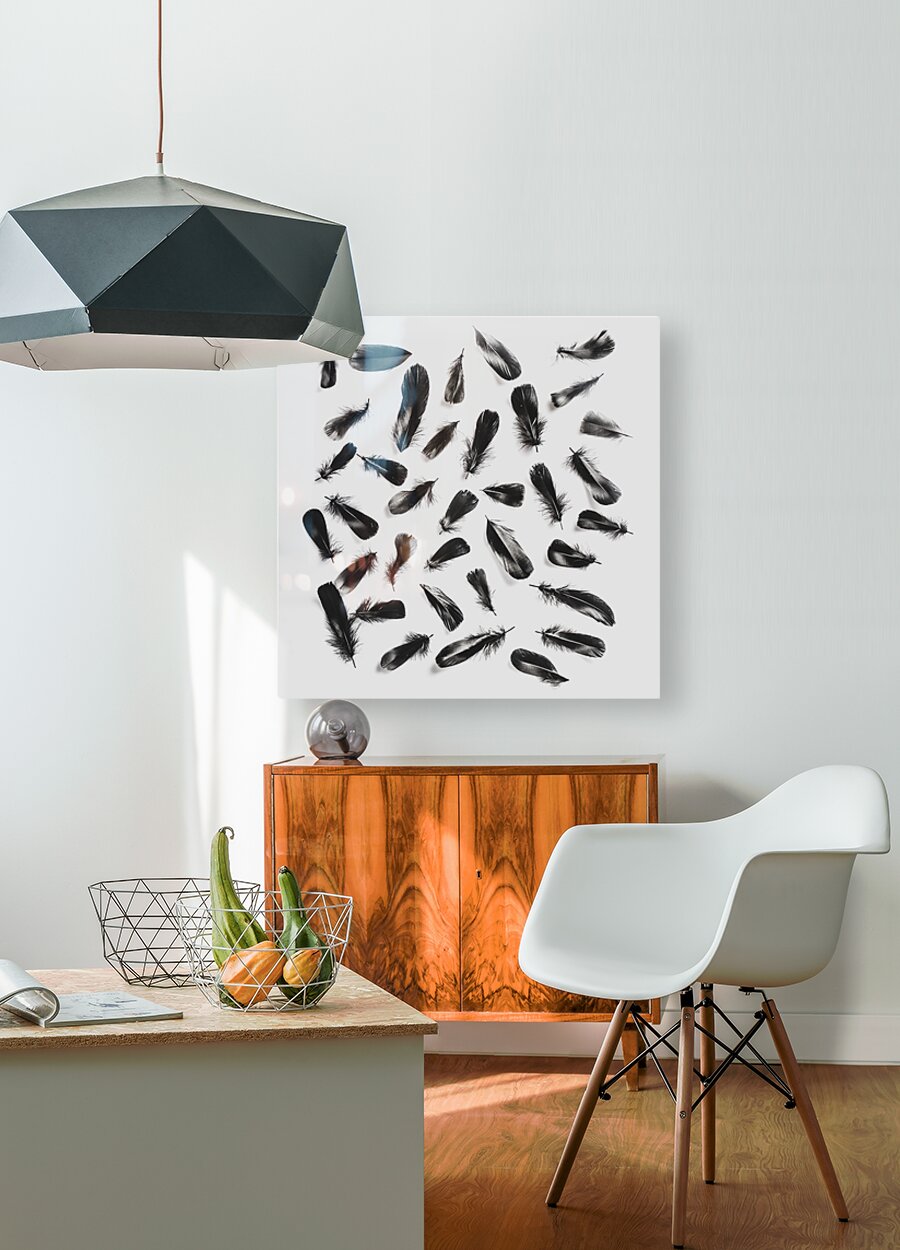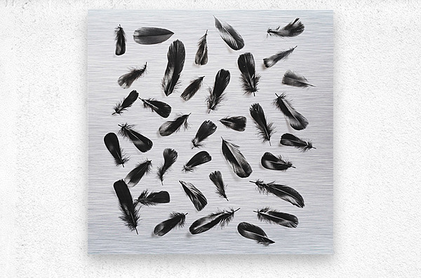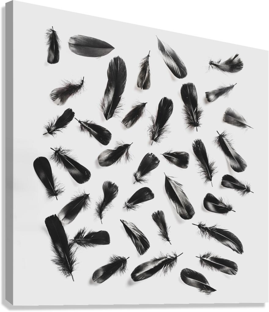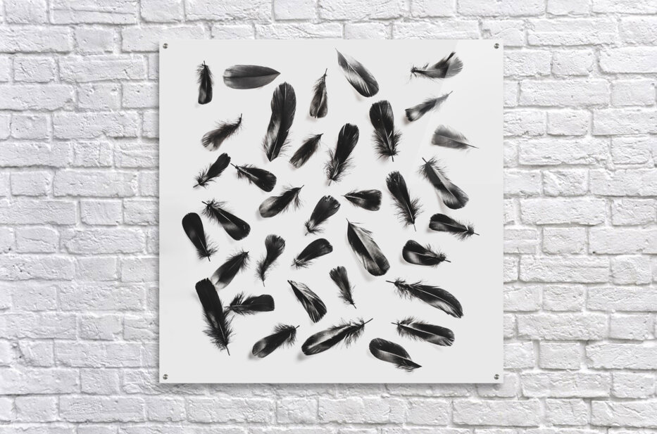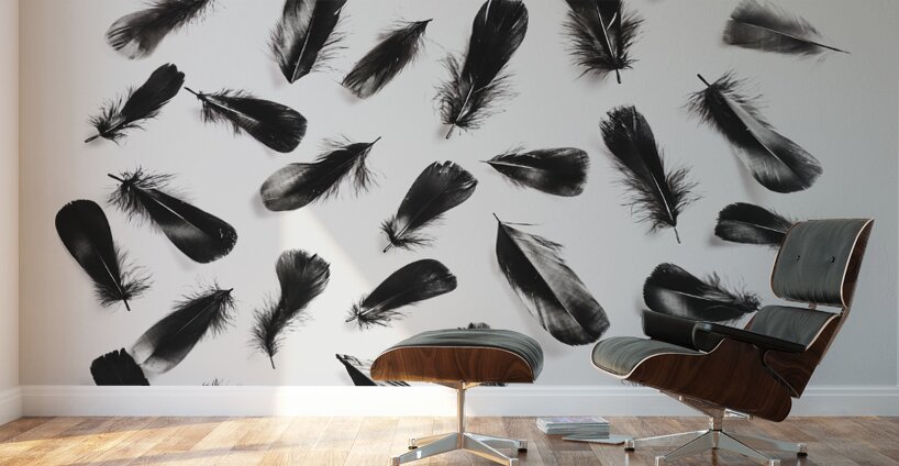 A layout of black feathers contrasting on a modern white background