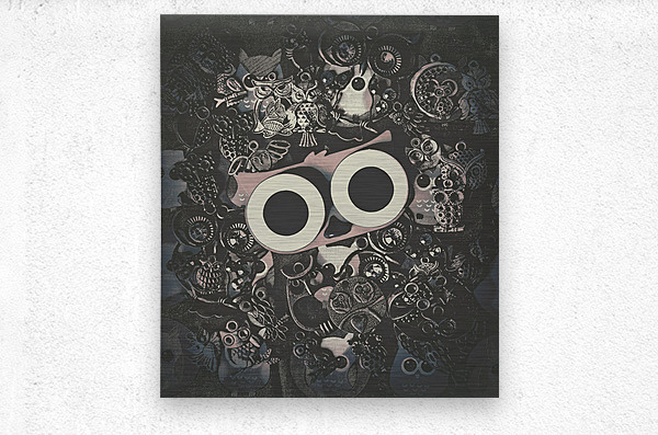 An industrial-style owl crafted from a collection of vintage and modern jewelry pieces stares out with wide white-rimmed eyes. The owls body is a dense and intricate cluster of metal charms and trinkets each with its own unique design and history.