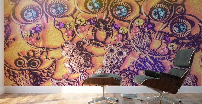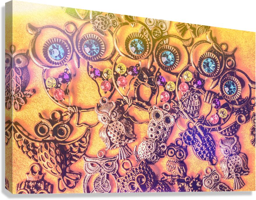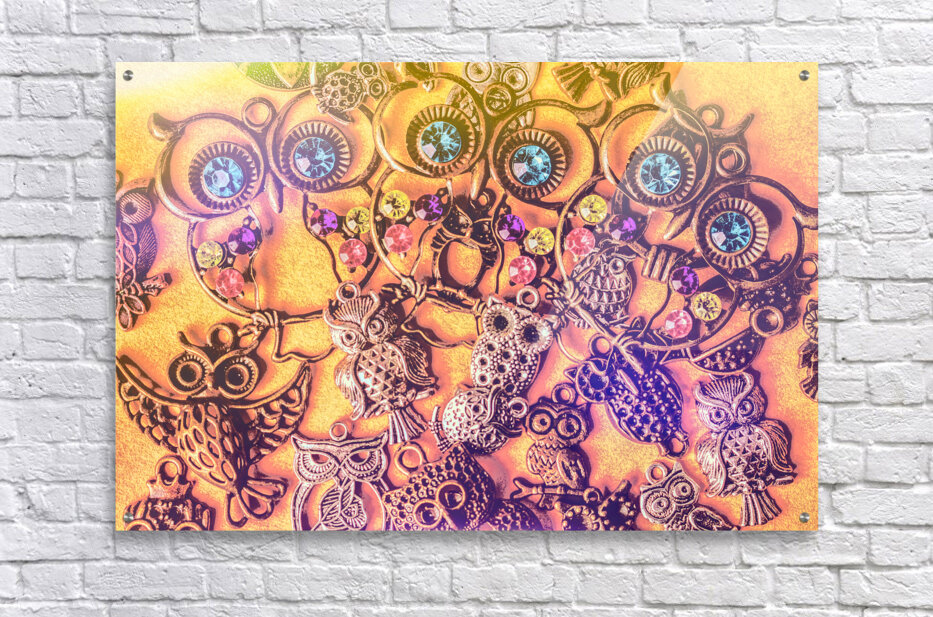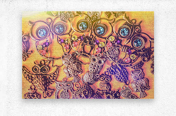 A vibrant close-up image showcasing a collection of vintage-inspired owl charms each crafted with intricate details and adorned with sparkling rhinestones. The charms are scattered across a warm golden background creating a visually captivating display of retro elegance.