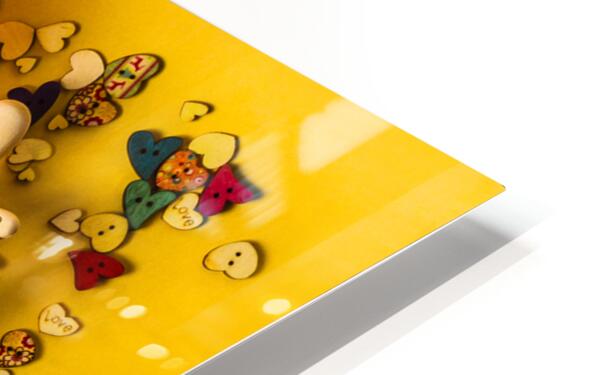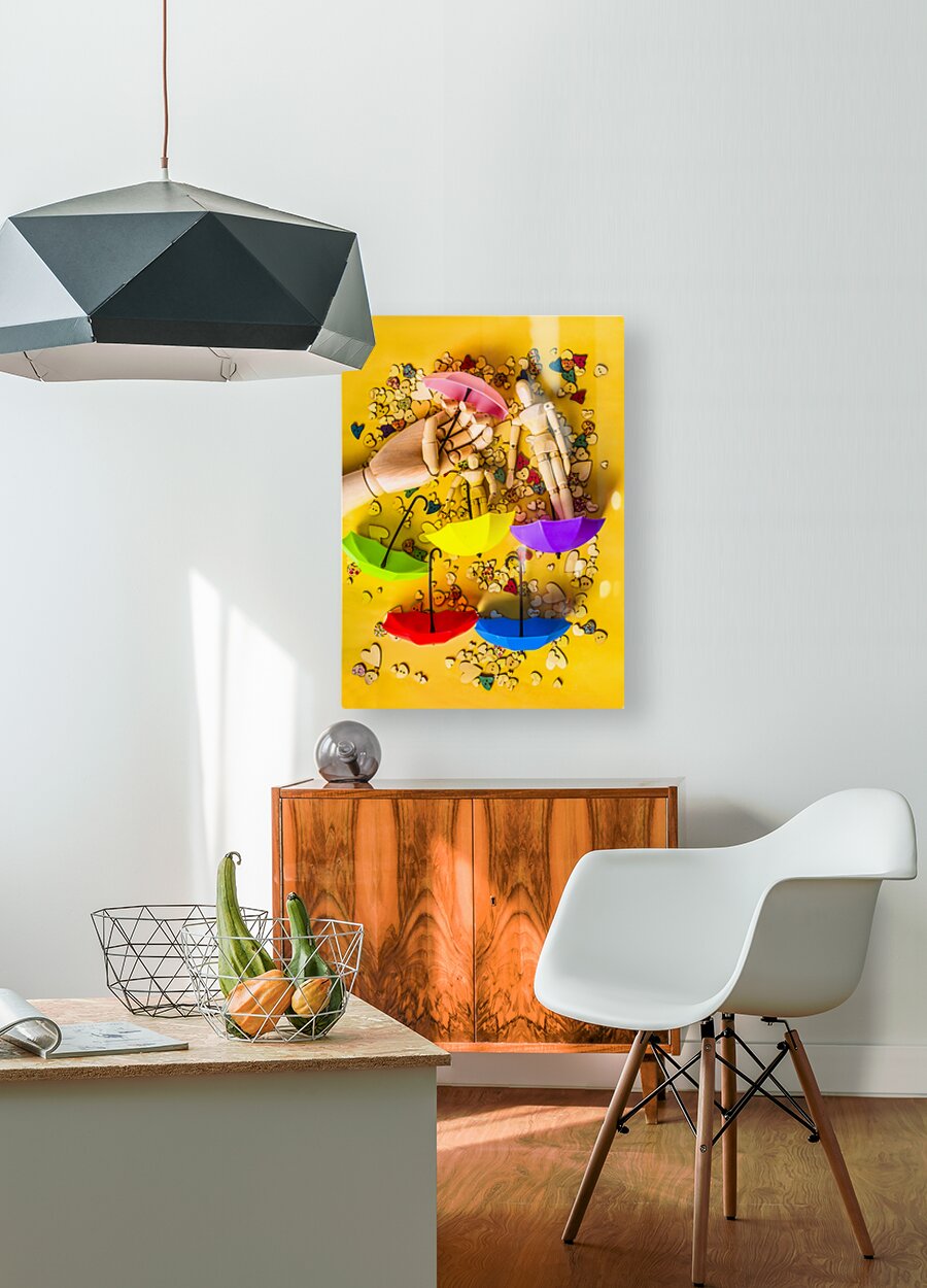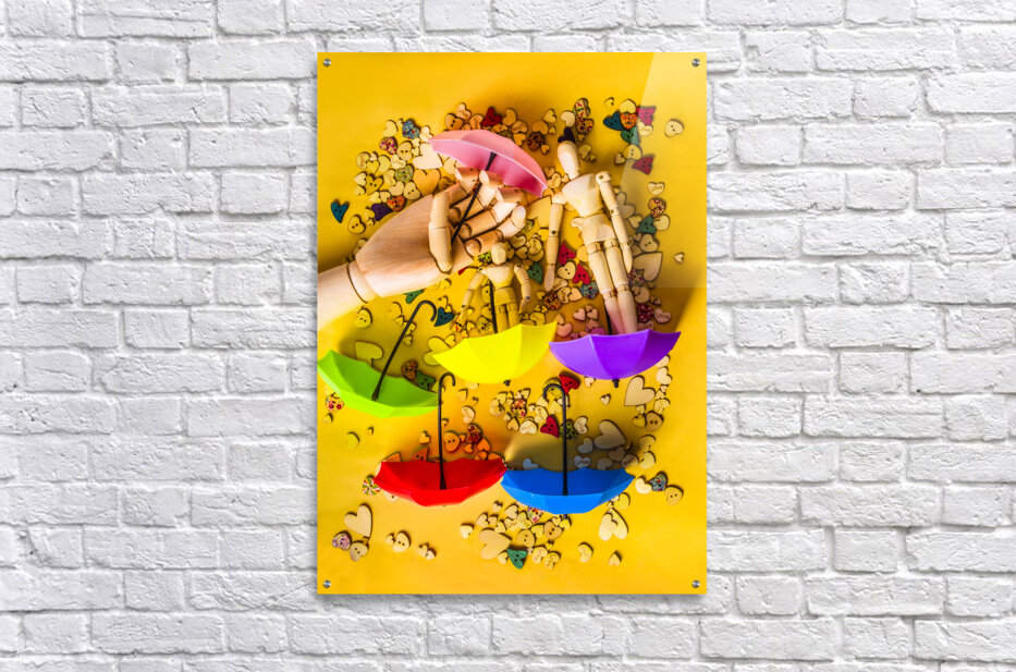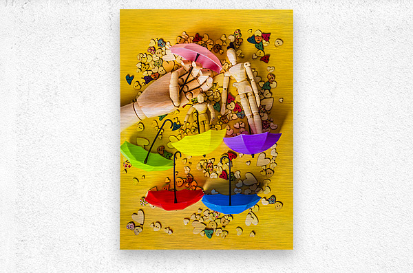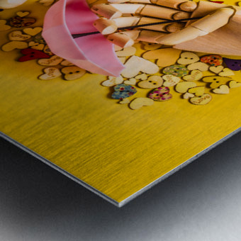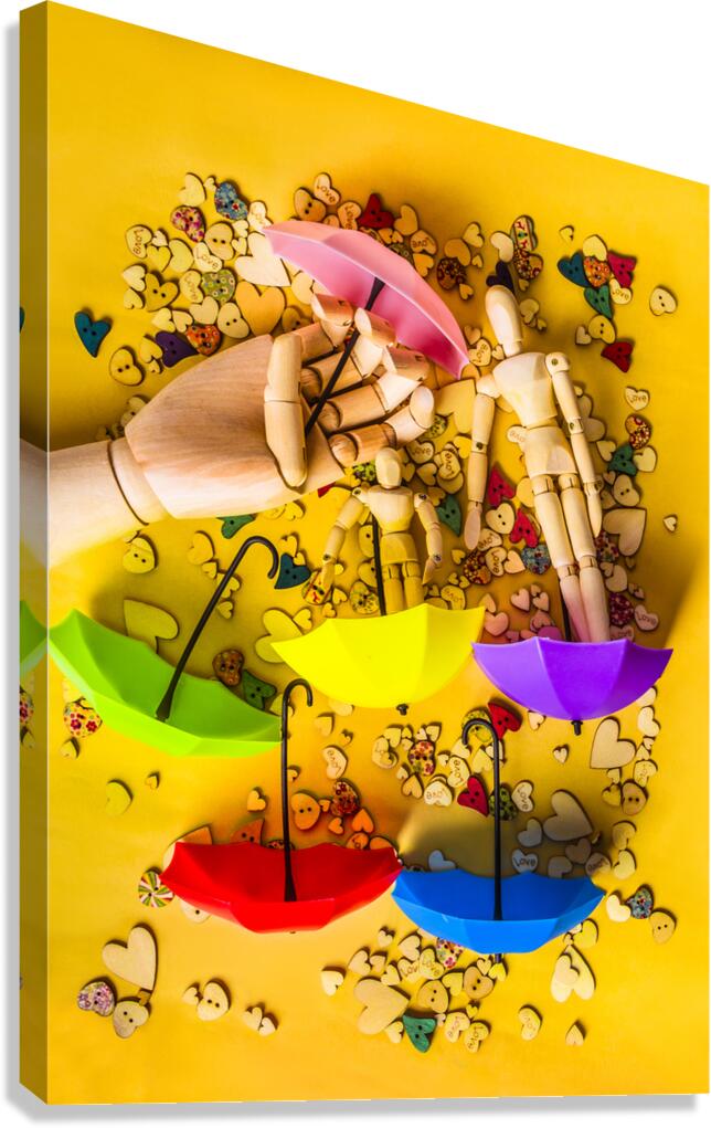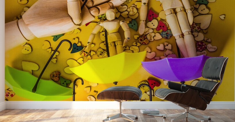 A scene of summertime staging with wooden figurines playing in the rain of button hearts and umbrellas