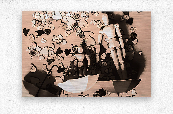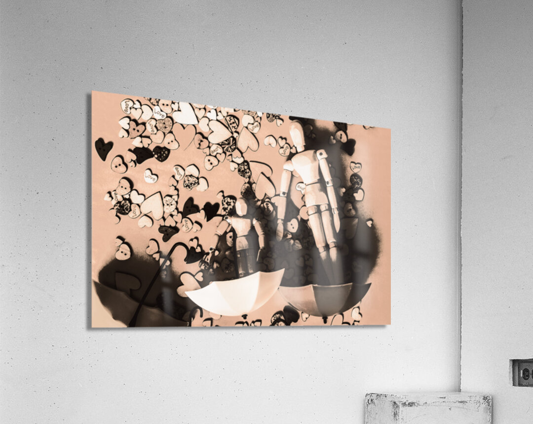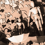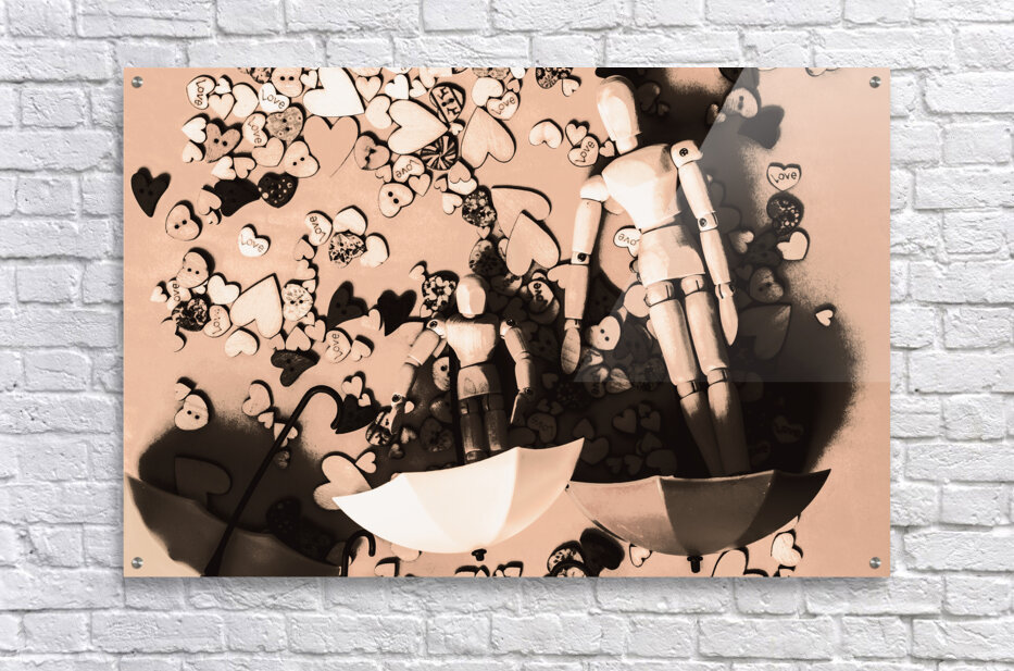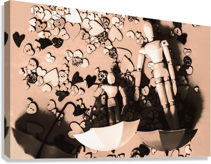 A dreamy vintage scene of after rain delights with toy figures playing among a scattering of button hearts and upside down umbrellas