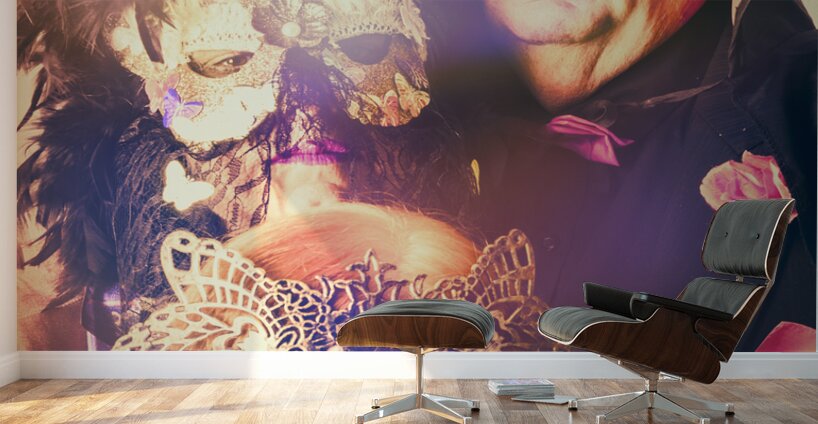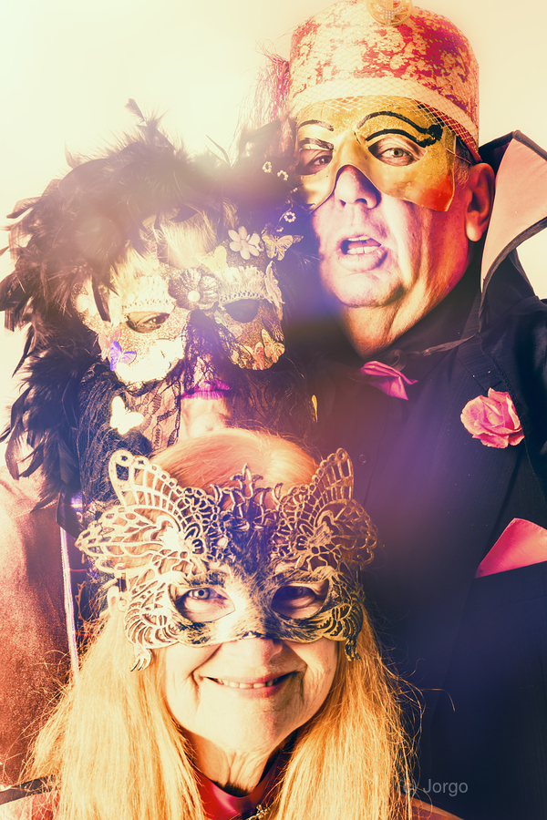 A retro styled photograph on the masked faces of 3 lovely masquerade party-goers dressed to impress under flared lighting