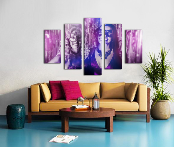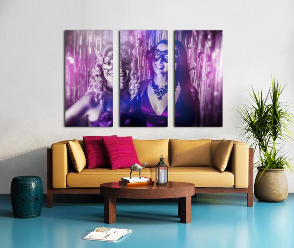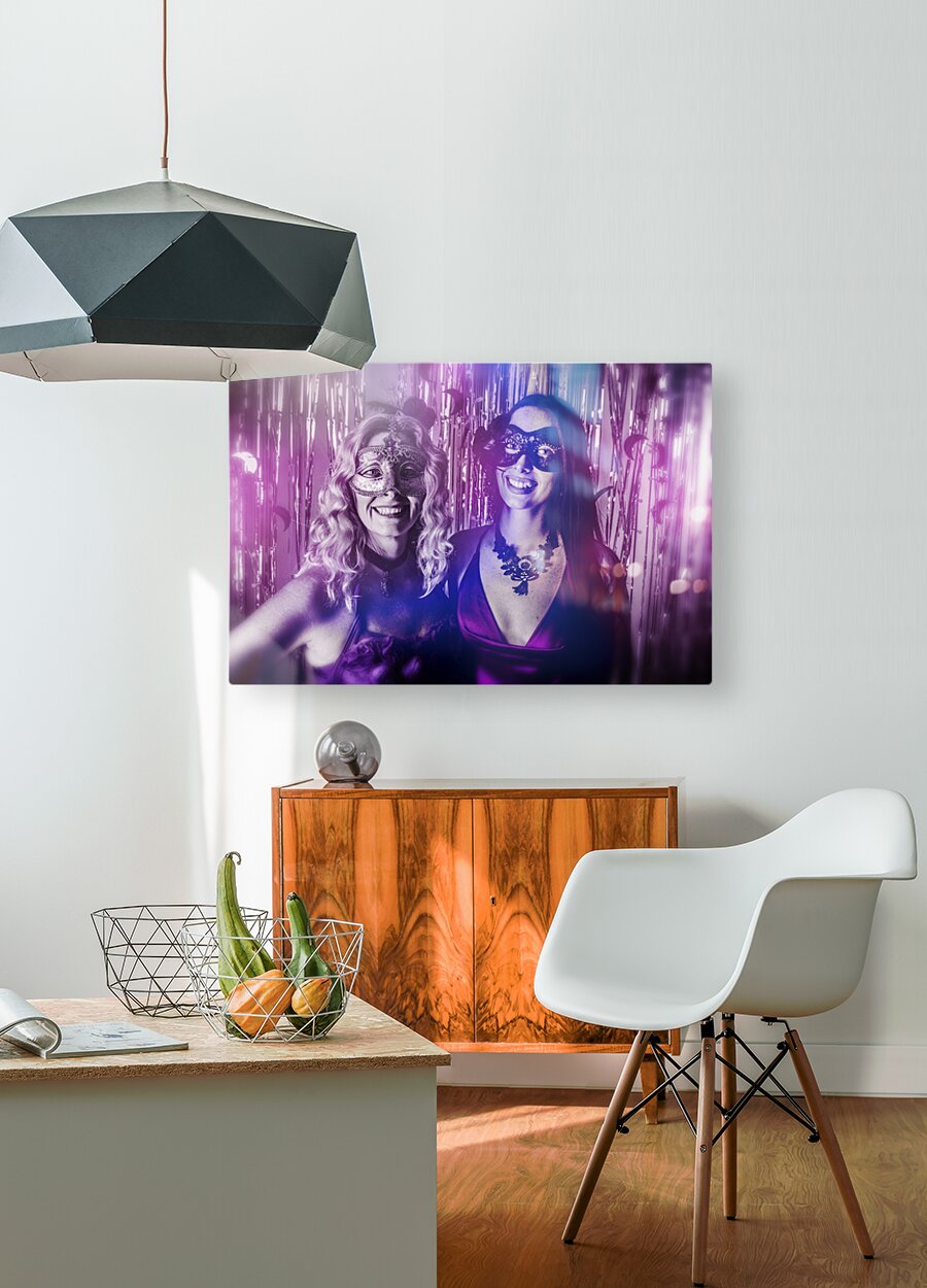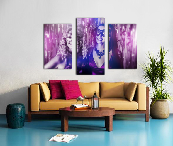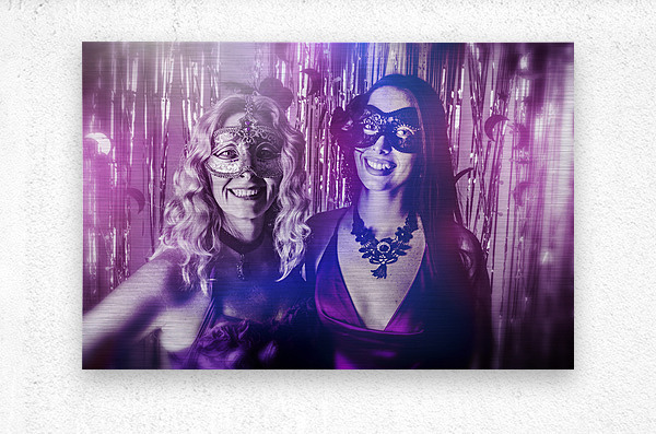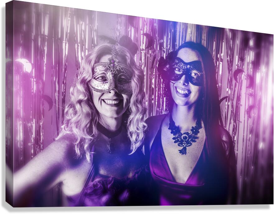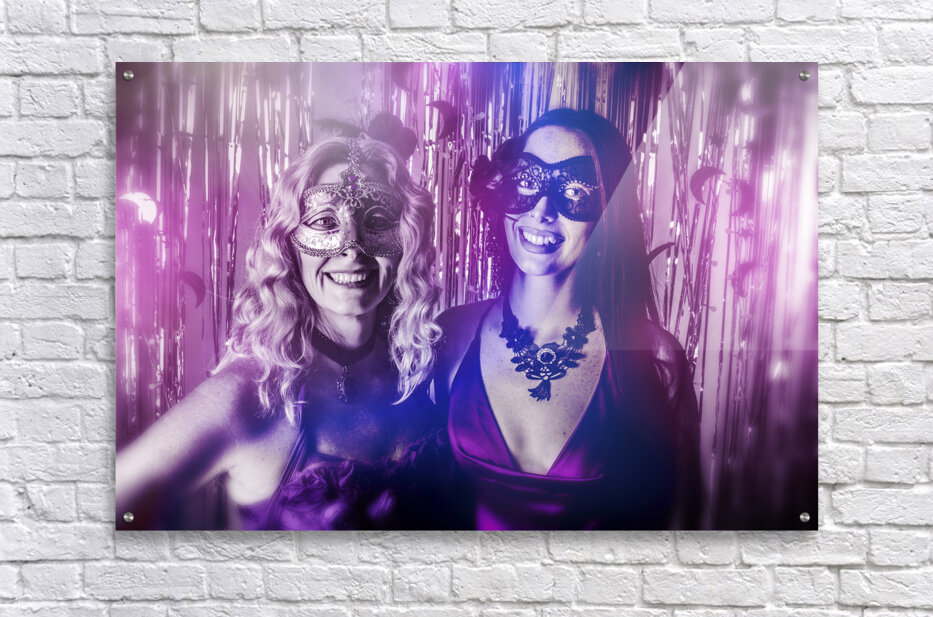 A dreamy scene of carnival gleam with lovely masquerading women dressed in masks before a curtain of silver shine