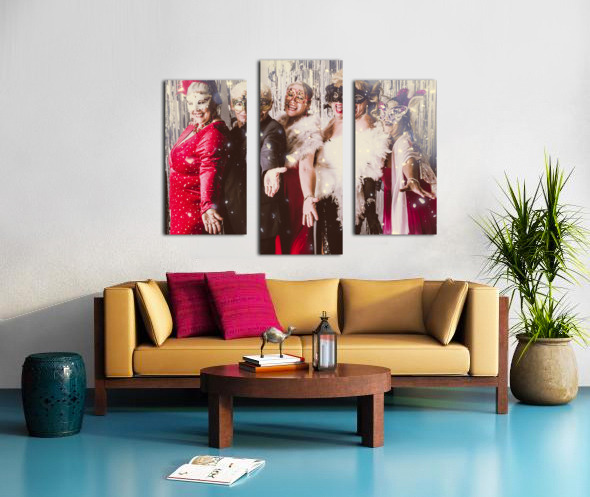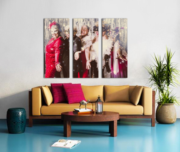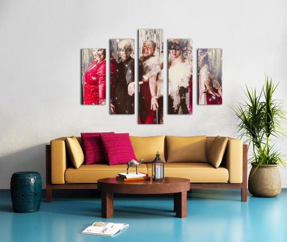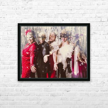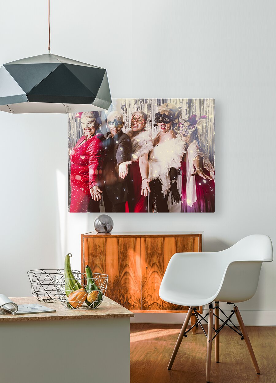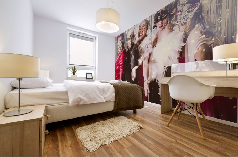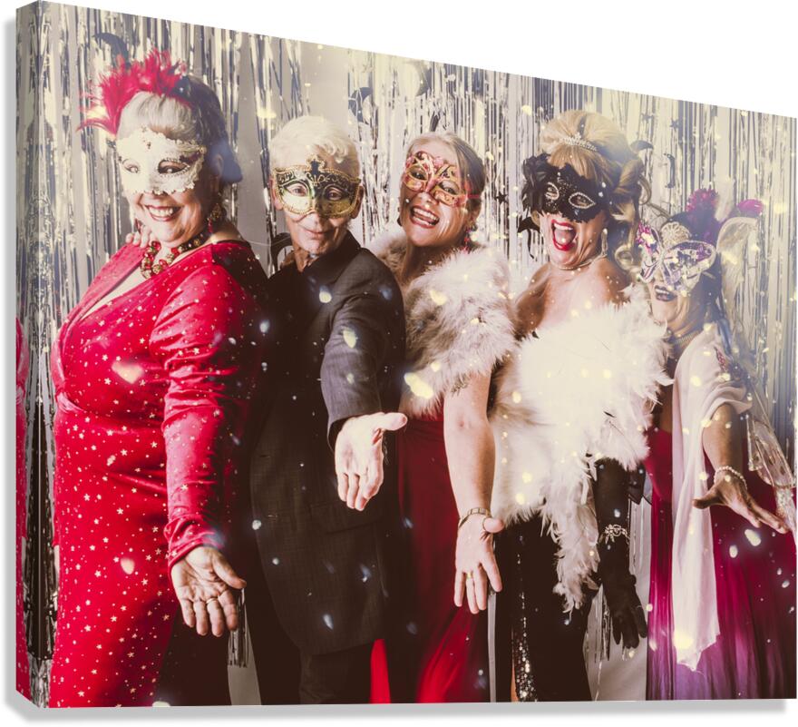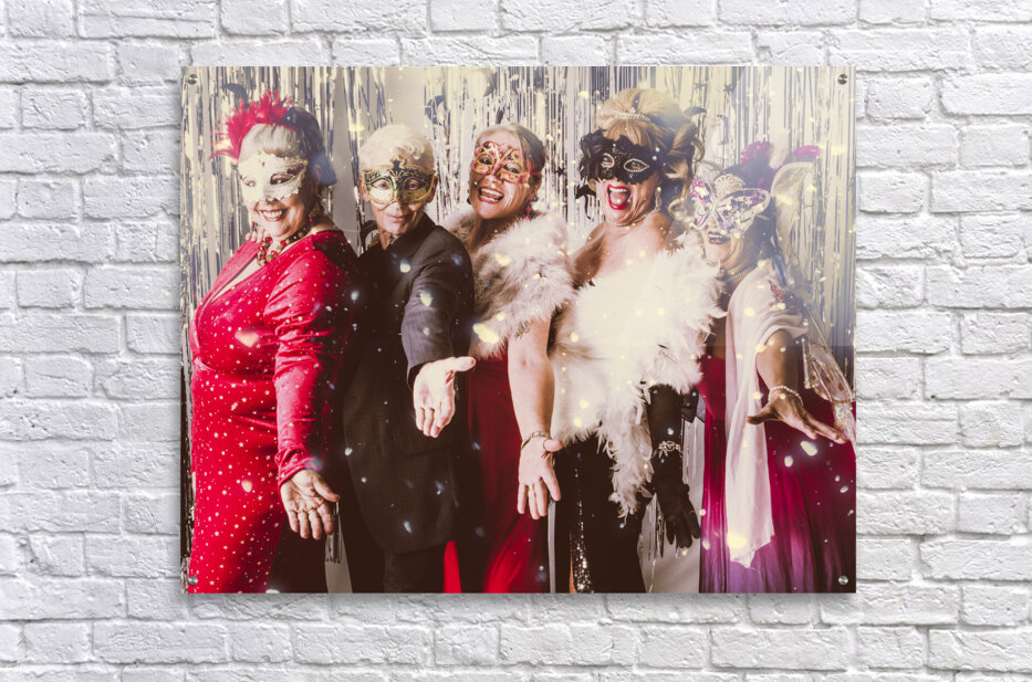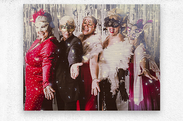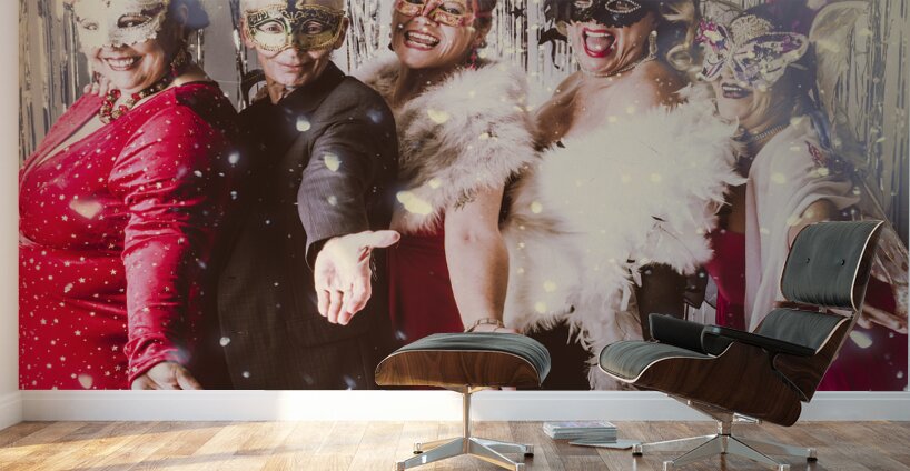 A group of friends celebrate in style donning masks and festive attire. The joyful expressions and glittering decor create a celebratory atmosphere