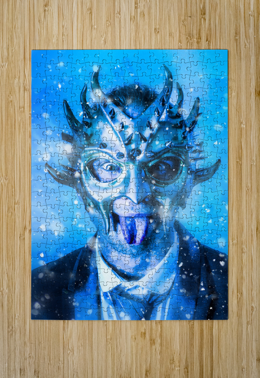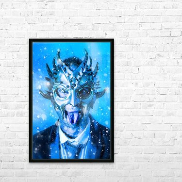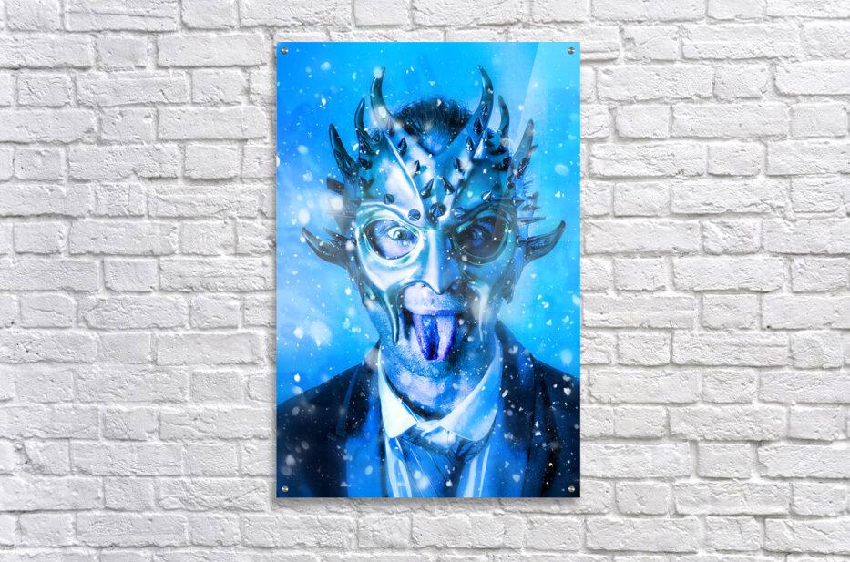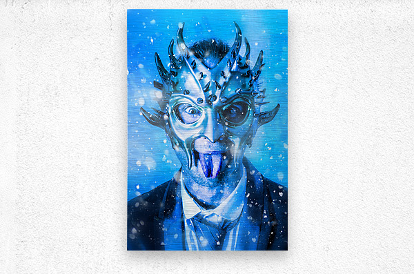 A man with a silver mask featuring spikes and horns in the shape of a grotesque and monstrous face grins broadly with his tongue sticking out. The backdrop is a swirling blue and white among the fall of ice and snow