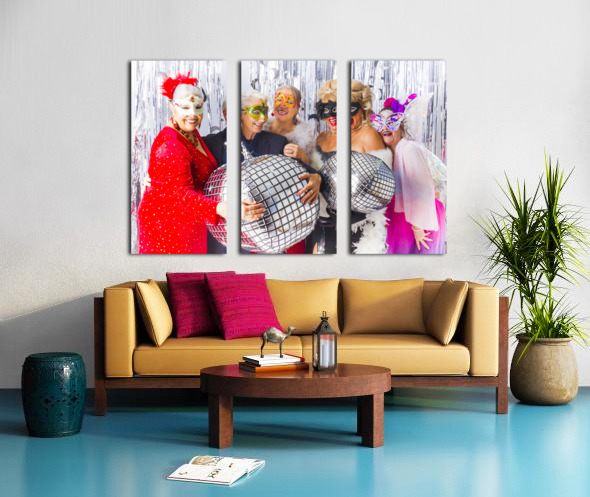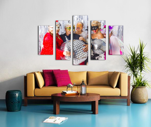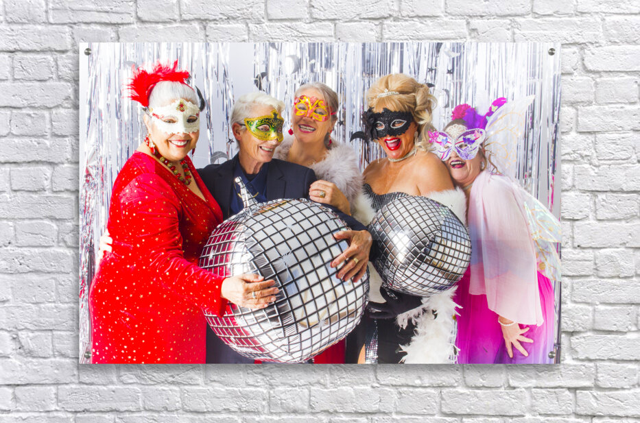 Five women wearing festive masks and glamorous attire pose with disco ball balloons at a party. They are surrounded by a silver tinsel backdrop adding to the celebratory atmosphere.