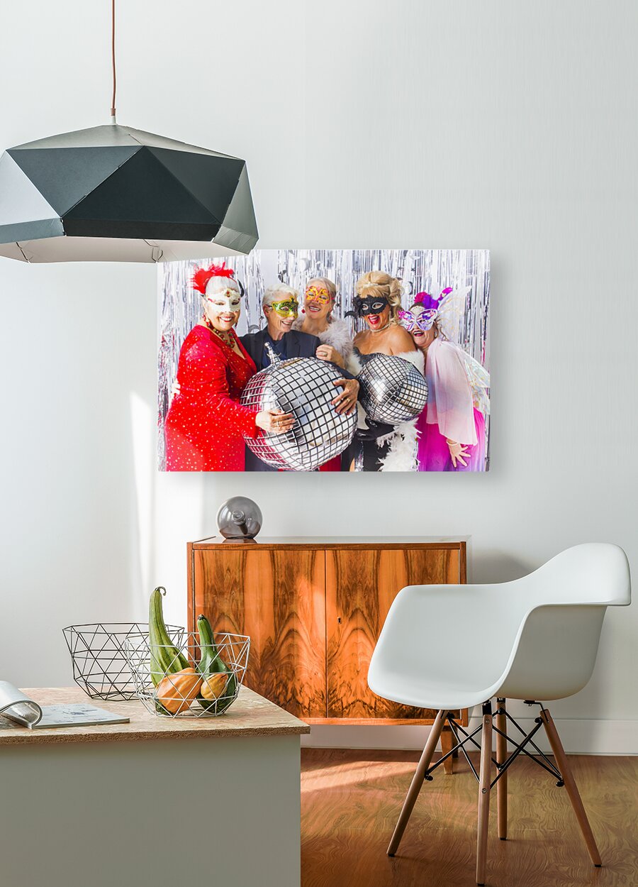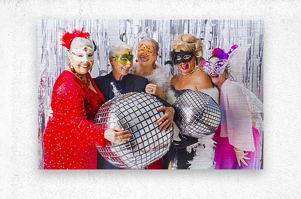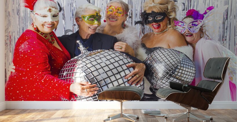 Five women wearing festive masks and glamorous attire pose with disco ball balloons at a party. They are surrounded by a silver tinsel backdrop adding...[+]