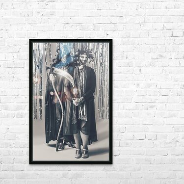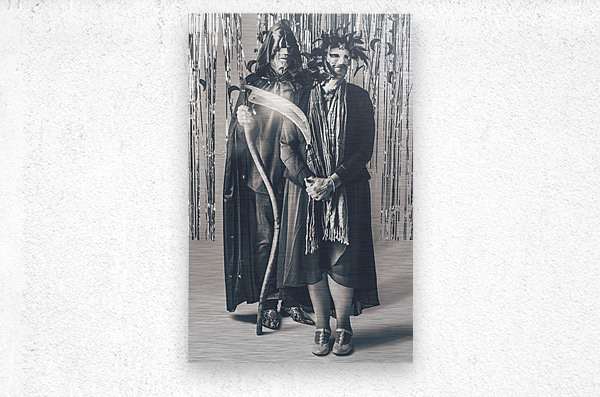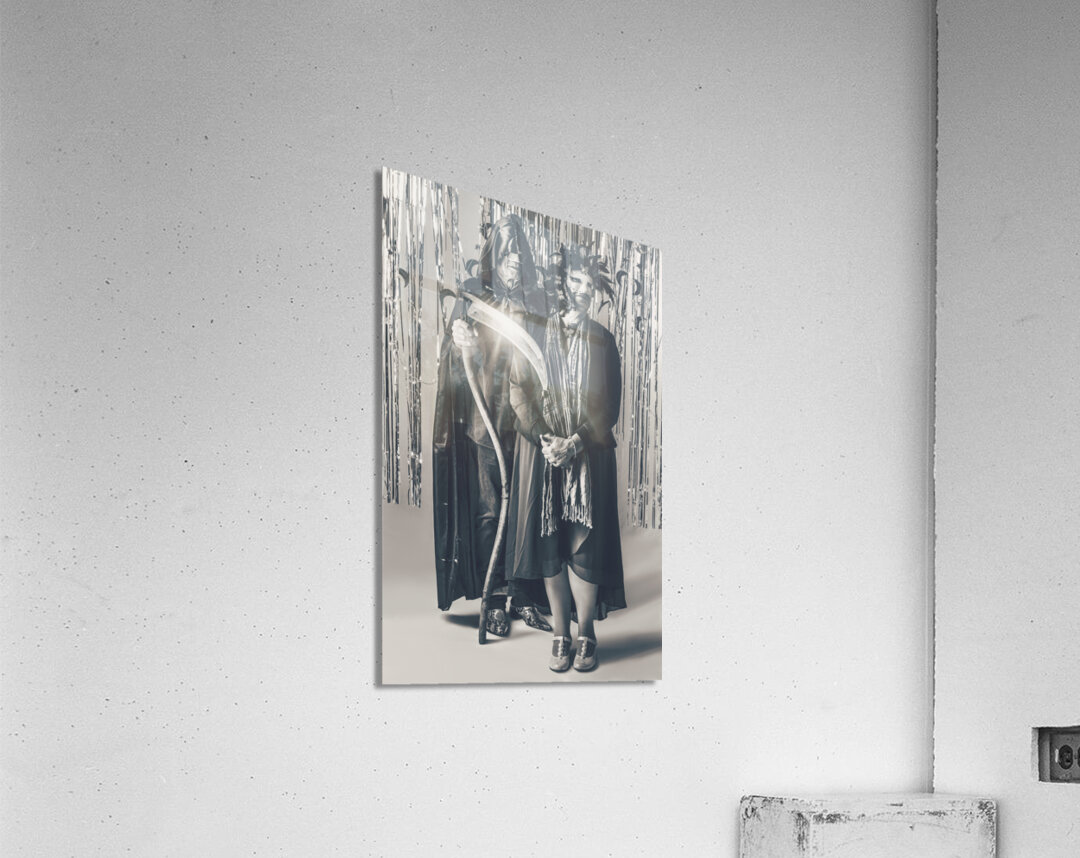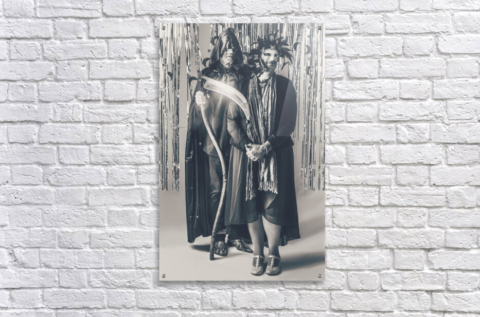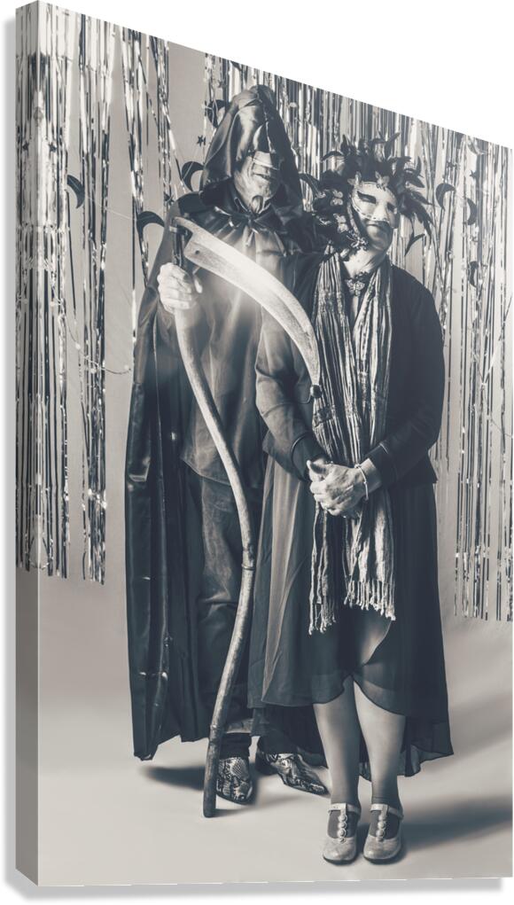 A masquerade of dance and death as a grim reaper stands by ready and waiting holding a scythe