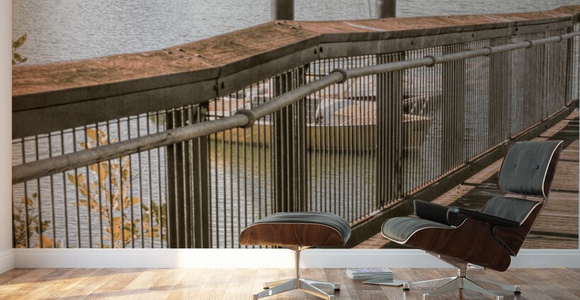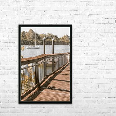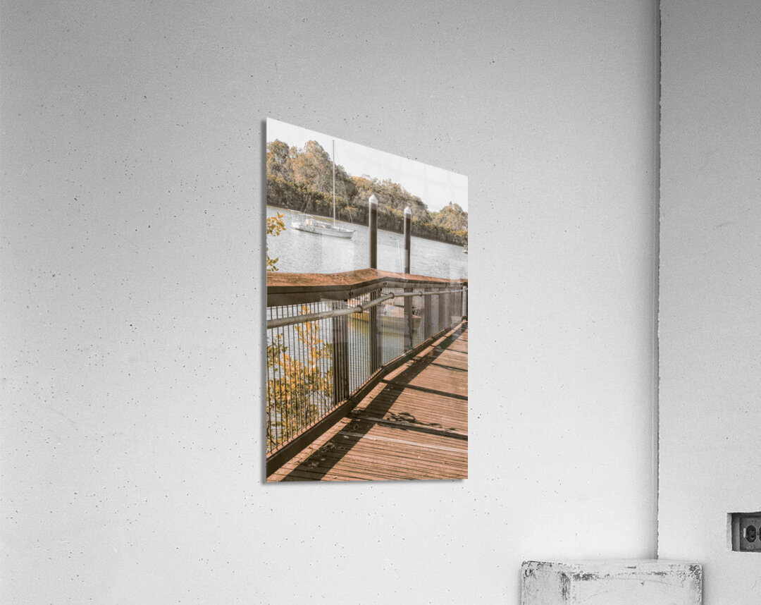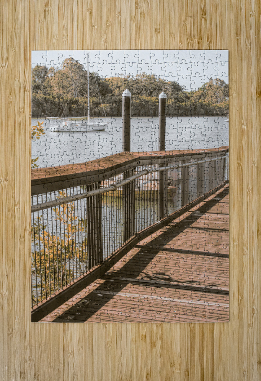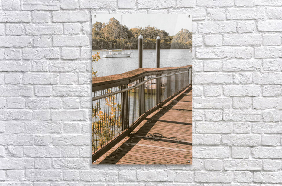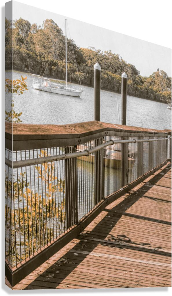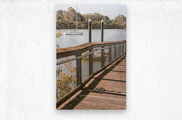 A stylised old riverwalk leading down a serene marine scene on a sunny peaceful afternoon. Burnett River Bundaberg Central Queensland Australia