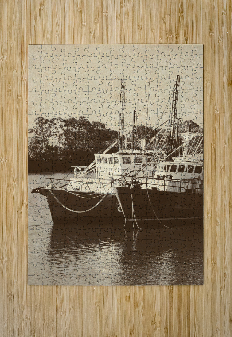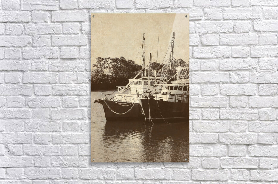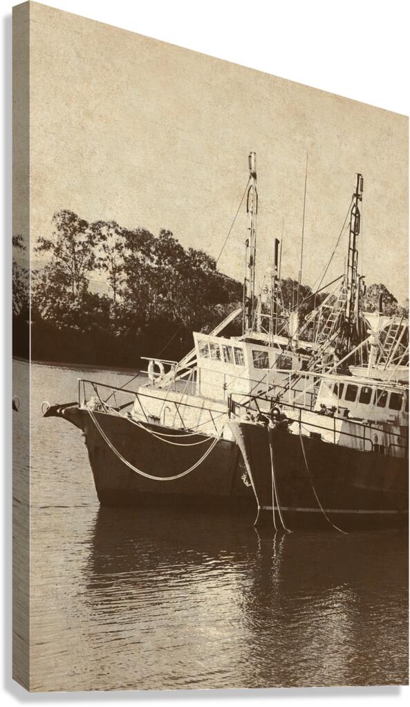 Two classic fishing boats are securely moored alongside each other in a tranquil river. Burnett River Bundaberg Central Queensland Australia