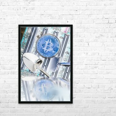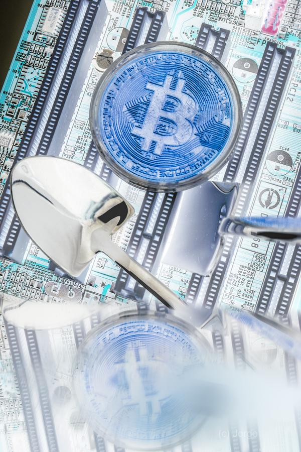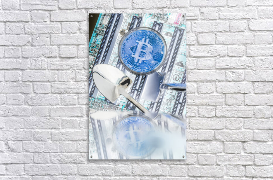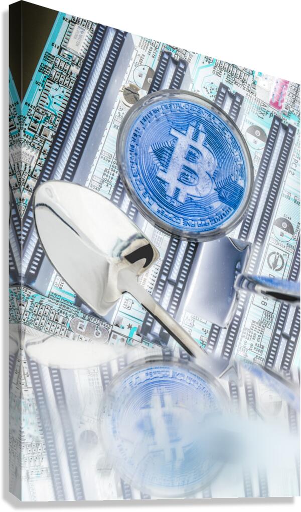 A shiny bitcoin representing sits beside a shovel symbolizing the digging for wealth in the digital finance sector